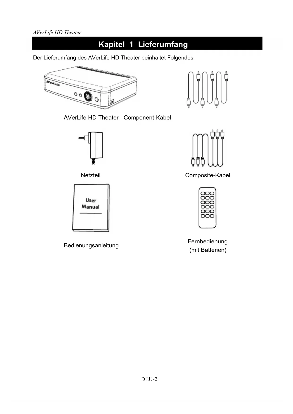 Der Lieferumfang des AVerLife HD Theater beinhaltet Folgendes: