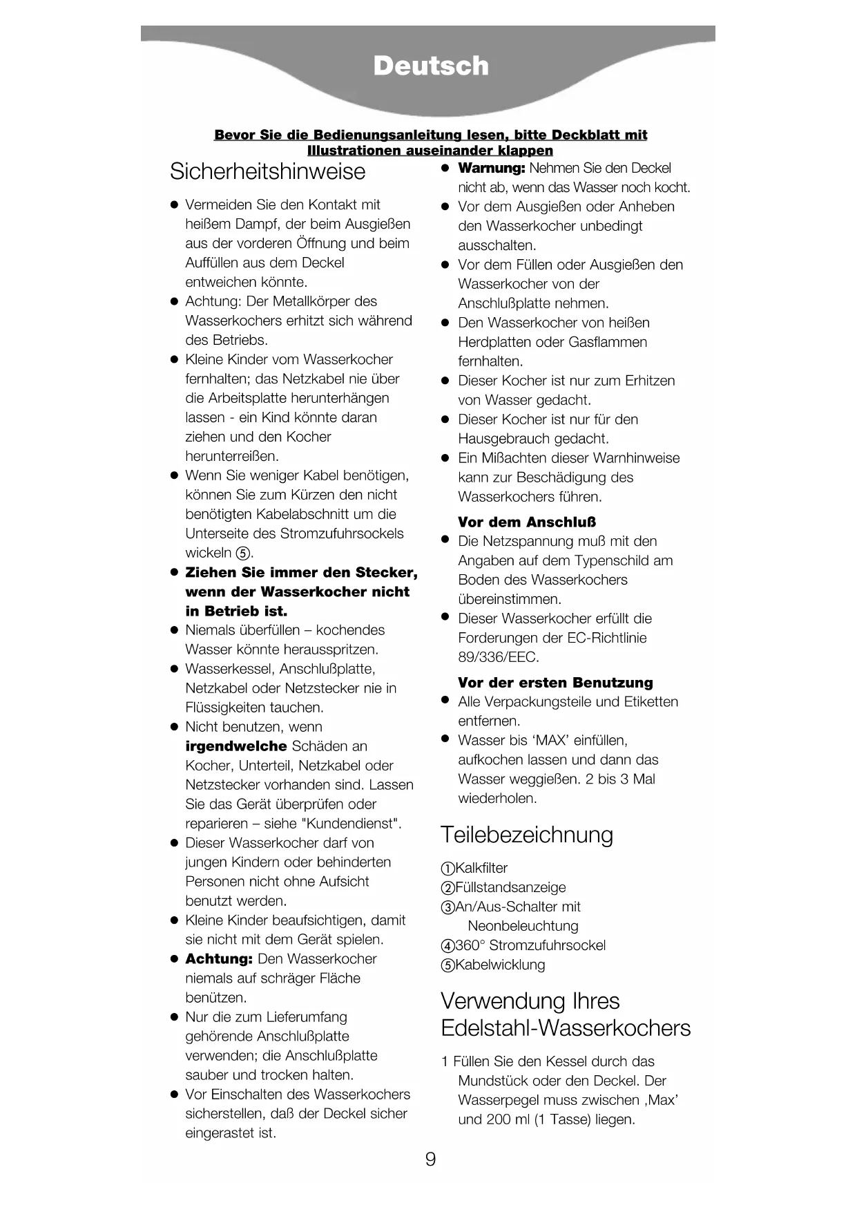 Bevor Sie die Bedienungsanleitung lesen, bitte Deckblatt mit