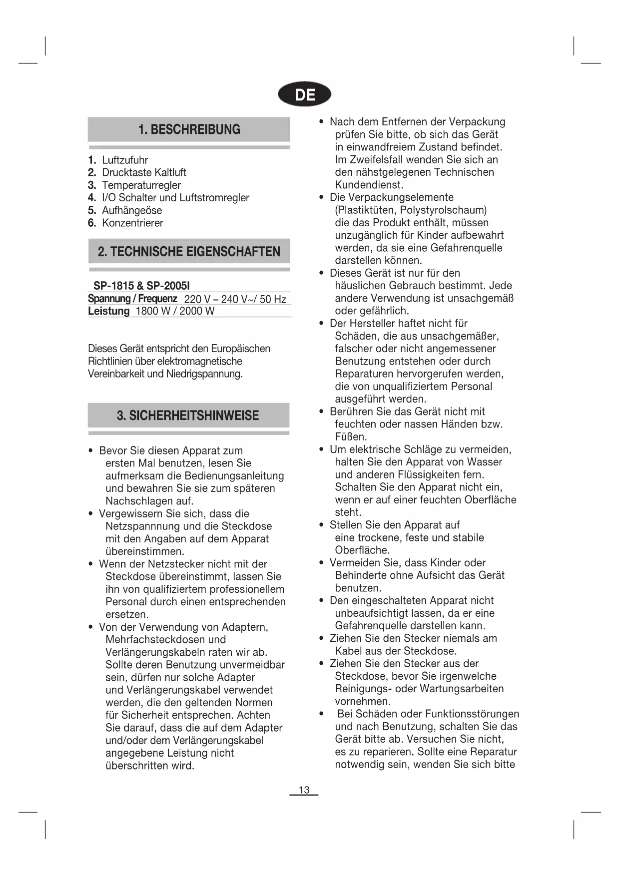 Dieses Gerät entspricht den Europäischen Richtlinien über elektromagnetische Vereinbarkeit und Niedrigspannung. SP-1815 & SP-2005I Spannung / Frequenz 220 V – 240 V~/ 50 Hz Leistung 1800 W / 2000 W14 ausschliesslich an einen autorisierten Technischen Kundendienst und bestehen Sie darauf, dass nur Original- Ersatzteile eingesetzt werden.