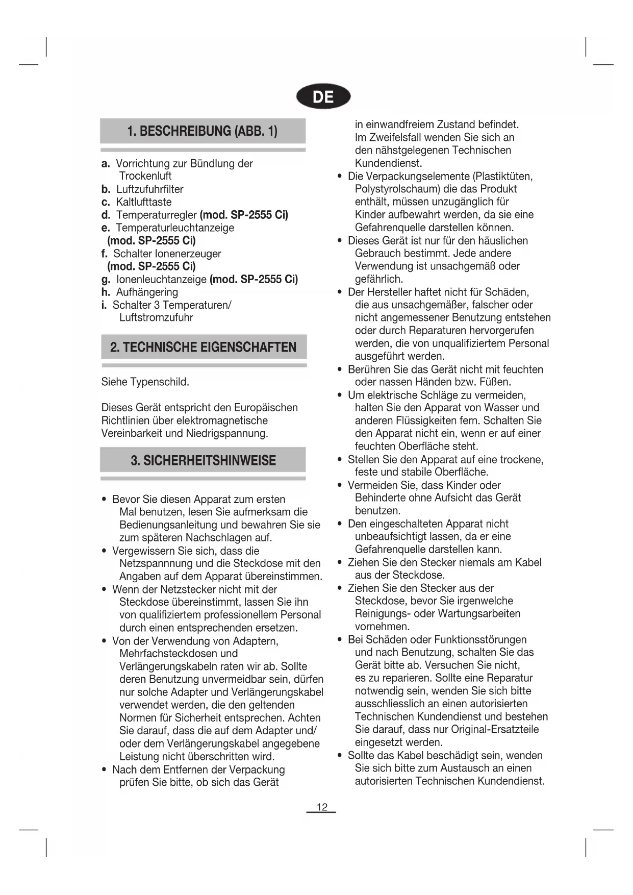 a. Vorrichtung zur Bündlung der Trockenluft b. Luftzufuhrfilter c. Kaltlufttaste d. Temperaturregler (mod. SP-2555 Ci) e. Temperaturleuchtanzeige (mod. SP-2555 Ci) f. Schalter Ionenerzeuger (mod. SP-2555 Ci) g. Ionenleuchtanzeige (mod. SP-2555 Ci) h. Aufhängering