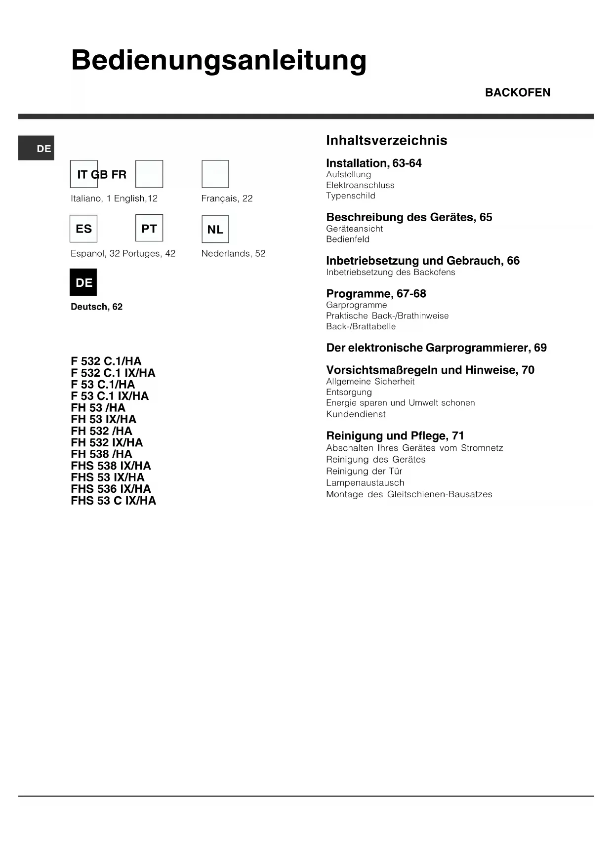 Inhaltsverzeichnis Installation, 63-64 AufstellungElektroanschlussTypenschild Beschreibung des Gerätes, 65 GeräteansichtBedienfeld Inbetriebsetzung und Gebrauch, 66 Inbetriebsetzung des Backofens Programme, 67-68 GarprogrammePraktische Back-/BrathinweiseBack-/Brattabelle Der elektronische Garprogrammierer, 69 Vorsichtsmaßregeln und Hinweise, 70 Allgemeine SicherheitEntsorgungEnergie sparen und Umwelt schonen Kundendienst Reinigung und Pflege, 71 Abschalten Ihres Gerätes vom Stromnetz Reinigung des Gerätes Reinigung der Tür Lampenaustausch Montage des Gleitschienen-Bausatzes Bedienungsanleitung BACKOFEN Français, 22 Espanol, 32 Portuges, 42 Deutsch, 62 Nederlands, 52