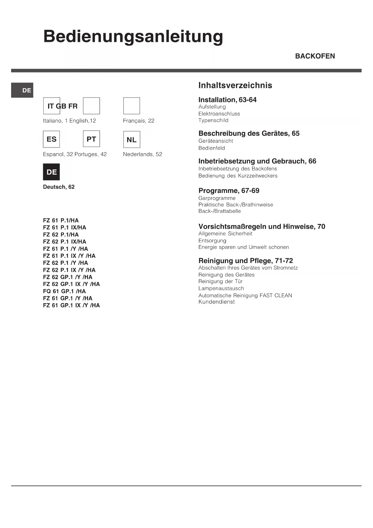 - het serienummer (S/N) Deze informatie bevindt zich op het typeplaatje op het apparaat en/of op de verpakking.Bedienungsanleitung BACKOFEN FZ 61 P.1/HA FZ 61 P.1 IX/HA FZ 62 P.1/HA FZ 62 P.1 IX/HA FZ 61 P.1 /Y /HA FZ 61 P.1 IX /Y /HA FZ 62 P.1 /Y /HA FZ 62 P.1 IX /Y /HA FZ 62 GP.1 /Y /HA FZ 62 GP.1 IX /Y /HA FQ 61 GP.1 /HA FZ 61 GP.1 /Y /HA FZ 61 GP.1 IX /Y /HA Inhaltsverzeichnis Installation, 63-64 AufstellungElektroanschlussTypenschild Beschreibung des Gerätes, 65 GeräteansichtBedienfeld Inbetriebsetzung und Gebrauch, 66 Inbetriebsetzung des BackofensBedienung des Kurzzeitweckers Programme, 67-69 GarprogrammePraktische Back-/BrathinweiseBack-/Brattabelle Vorsichtsmaßregeln und Hinweise, 70 Allgemeine SicherheitEntsorgungEnergie sparen und Umwelt schonen Reinigung und Pflege, 71-72 Abschalten Ihres Gerätes vom StromnetzReinigung des GerätesReinigung der TürLampenaustauschAutomatische Reinigung FAST CLEAN Kundendienst Français, 22 Espanol, 32 Portuges, 42 Deutsch, 62 Nederlands, 52