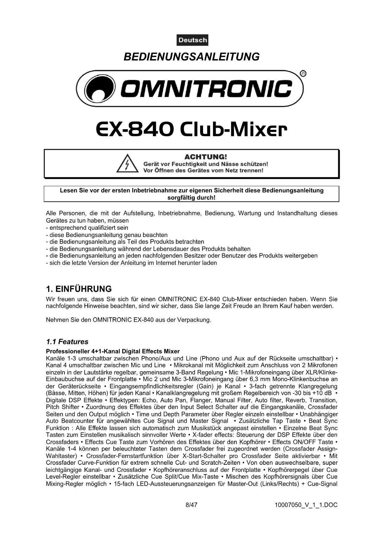 ACHTUNG! Seien Sie besonders vorsichtig beim Umgang mit gefährlicher Netzspannung. Bei die- ser Spannung können Sie einen lebensgefährlichen elektrischen Schlag erhalten! Dieses Gerät hat das Werk in sicherheitstechnisch einwandfreiem Zustand verlassen. Um diesen Zustand zu erhalten und einen gefahrlosen Betrieb sicherzustellen, muss der Anwender unbedingt die Sicherheits- hinweise und die Warnvermerke beachten, die in dieser Gebrauchsanweisung enthalten sind. Unbedingt lesen: Bei Schäden, die durch Nichtbeachtung dieser Bedienungsanleitung verursacht werden, erlischt der Garantieanspruch. Für daraus resultierende Folgeschäden übernimmt der Hersteller keine Haftung. Bitte überprüfen Sie vor der ersten Inbetriebnahme, ob kein offensichtlicher Transportschaden vorliegt. Sollten Sie Schäden an der Netzleitung oder am Gehäuse entdecken, nehmen Sie das Gerät nicht in Betrieb und setzen sich bitte mit Ihrem Fachhändler in Verbindung. Der Aufbau entspricht der Schutzklasse I. Der Netzstecker darf nur an eine Schutzkontakt-Steckdose angeschlossen werden, deren Spannung und Frequenz mit dem Typenschild des Gerätes genau übereinstimmt. Ungeeignete Spannungen und ungeeignete Steckdosen können zur Zerstörung des Gerätes und zu tödlichen Stromschlägen führen. Den Netzstecker immer als letztes einstecken. Der Netzstecker muss dabei gewaltfrei eingesetzt werden. Achten Sie auf einen festen Sitz des Netzsteckers. Lassen Sie die Netzleitung nicht mit anderen Kabeln in Kontakt kommen! Seien Sie vorsichtig beim Umgang mit Netzleitungen und -anschlüssen. Fassen Sie diese Teile nie mit feuchten Händen an! Feuchte Hände können tödliche Stromschläge zu Folge haben. Netzleitungen nicht verändern, knicken, mechanisch belasten, durch Druck belasten, ziehen, erhitzen und nicht in die Nähe von Hitze- oder Kältequellen bringen. Bei Missachtung kann es zu Beschädigungen der Netzleitung, zu Brand oder zu tödlichen Stromschlägen kommen. Die Kabeleinführung oder die Kupplung am Gerät dürfen nicht durch Zug belastet werden. Es muss stets eine ausreichende Kabellänge zum Gerät hin vorhanden sein. Andernfalls kann das Kabel beschädigt werden, was zu tödlichen Stromschlägen führen kann. Achten Sie darauf, dass die Netzleitung nicht gequetscht oder durch scharfe Kanten beschädigt werden kann. Überprüfen Sie das Gerät und die Netzleitung in regelmäßigen Abständen auf Beschädigungen. Werden Verlängerungsleitungen verwendet muss sichergestellt werden, dass der Adernquerschnitt für die benötigte Stromzufuhr des Gerätes zugelassen ist. Alle Warnhinweise für die Netzleitung gelten auch für evtl. Verlängerungsleitungen. Gerät bei Nichtbenutzung und vor jeder Reinigung vom Netz trennen! Fassen Sie dazu den Netzstecker an der Griffläche an und ziehen Sie niemals an der Netzleitung! Ansonsten kann das Kabel und der Stecker beschädigt werden was zu tödlichen Stromschlägen führen kann. Sind Stecker oder Geräteschalter, z. B. durch Einbau nicht erreichbar, so muss netzseitig eine allpolige Abschaltung vorgenommen werden. Wenn der Netzstecker oder das Gerät staubig ist, dann muss es außer Betrieb genommen werden, der Stromkreis muss allpolig unterbrochen werden und das Gerät mit einem trockenen Tuch gereinigt werden.10007050_V_1_1.DOC 10/47 Staub kann die Isolation reduzieren, was zu tödlichen Stromschlägen führen kann. Stärkere Verschmut- zungen im und am Gerät dürfen nur von einem Fachmann beseitigt werden. Es dürfen unter keinen Umständen Flüssigkeiten aller Art in Steckdosen, Steckverbindungen oder in irgendwelche Geräteöffnungen oder Geräteritzen eindringen. Besteht der Verdacht, dass - auch nur minimale - Flüssigkeit in das Gerät eingedrungen sein könnte, muss das Gerät sofort allpolig vom Netz getrennt werden. Dies gilt auch, wenn das Gerät hoher Luftfeuchtigkeit ausgesetzt war. Auch wenn das Gerät scheinbar noch funktioniert, muss es von einen Fachmann überprüft werden ob durch den Flüssigkeitseintritt eventuell Isolationen beeinträchtigt wurden. Reduzierte Isolationen können tödliche Stromschläge hervorrufen. In das Gerät dürfen keine fremden Gegenstände gelangen. Dies gilt insbesondere für Metallteile. Sollten auch nur kleinste Metallteile wie Heft- und Büroklammern oder gröbere Metallspäne in das Gerät gelangen, so ist das Gerät sofort außer Betrieb zu nehmen und allpolig vom Netz zu trennen. Durch Metallteile hervorgerufene Fehlfunktionen und Kurzschlüsse können tödliche Verletzungen zur Folge haben. Bevor das Gerät eingeschaltet wird, müssen alle Fader und Lautstärkeregler auf "0" bzw. auf minimum gestellt werden. ACHTUNG: Endstufen immer zuletzt einschalten und zuerst ausschalten! Kinder und Laien vom Gerät fern halten! ACHTUNG: Zu hohe Lautstärken können das Gehör schädigen! Im Geräteinneren befinden sich keine zu wartenden Teile. Eventuelle Servicearbeiten sind ausschließlich dem autorisierten Fachhandel vorbehalten!
