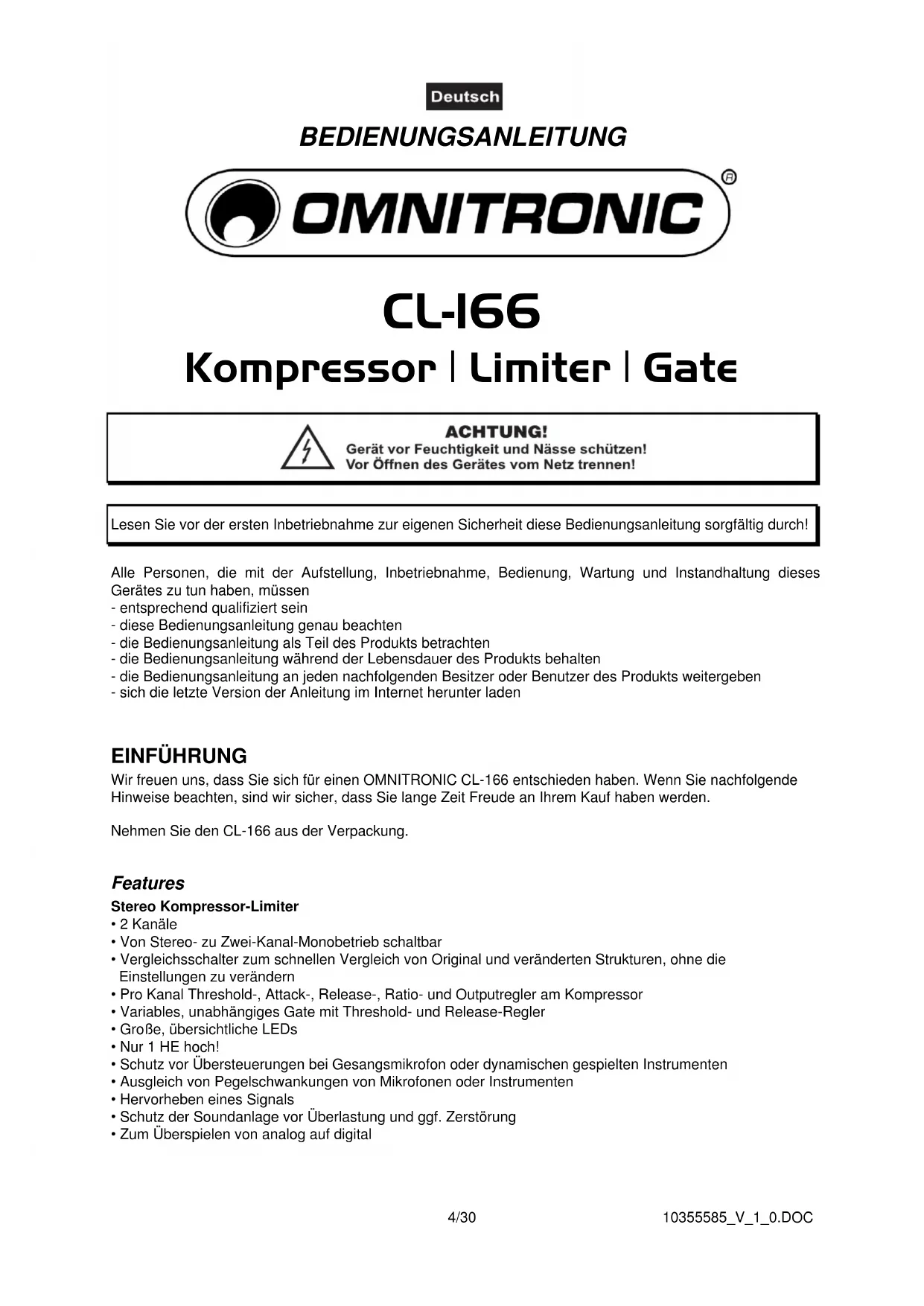 - CARACTÉRISTIQUES TECHNIQUES Das neueste Update dieser Bedienungsanleitung finden Sie im Internet unter: You can find the latest update of this user manual in the Internet under: Vous pouvez trouvez la dernière version de ce mode d'emploi dans l'Internet sous: www.omnitronic.com10355585_V_1_0.DOC 4/30 BEDIENUNGSANLEITUNG CL-166 Kompressor I Limiter I Gate Lesen Sie vor der ersten Inbetriebnahme zur eigenen Sicherheit diese Bedienungsanleitung sorgfältig durch!Alle Personen, die mit der Aufstellung, Inbetriebnahme, Bedienung, Wartung und Instandhaltung diesesGerätes zu tun haben, müssen- entsprechend qualifiziert sein- diese Bedienungsanleitung genau beachten- die Bedienungsanleitung als Teil des Produkts betrachten- die Bedienungsanleitung während der Lebensdauer des Produkts behalten- die Bedienungsanleitung an jeden nachfolgenden Besitzer oder Benutzer des Produkts weitergeben- sich die letzte Version der Anleitung im Internet herunter laden EINFÜHRUNG Wir freuen uns, dass Sie sich für einen OMNITRONIC CL-166 entschieden haben. Wenn Sie nachfolgendeHinweise beachten, sind wir sicher, dass Sie lange Zeit Freude an Ihrem Kauf haben werden.Nehmen Sie den CL-166 aus der Verpackung. Features Stereo Kompressor-Limiter• 2 Kanäle• Von Stereo- zu Zwei-Kanal-Monobetrieb schaltbar• Vergleichsschalter zum schnellen Vergleich von Original und veränderten Strukturen, ohne die Einstellungen zu verändern• Pro Kanal Threshold-, Attack-, Release-, Ratio- und Outputregler am Kompressor• Variables, unabhängiges Gate mit Threshold- und Release-Regler• Große, übersichtliche LEDs• Nur 1 HE hoch!• Schutz vor Übersteuerungen bei Gesangsmikrofon oder dynamischen gespielten Instrumenten• Ausgleich von Pegelschwankungen von Mikrofonen oder Instrumenten• Hervorheben eines Signals• Schutz der Soundanlage vor Überlastung und ggf. Zerstörung• Zum Überspielen von analog auf digital10355585_V_1_0.DOC 5/30 SICHERHEITSHINWEISE ACHTUNG! SeienSiebesondersvorsichtigbeimUmgangmitgefährlicherNetzspannung.Beidie- serSpannungkönnenSieeinenlebensgefährlichenelektrischenSchlagerhalten! Dieses Gerät hat das Werk in sicherheitstechnisch einwandfreiem Zustand verlassen. Um diesen Zustand zu erhalten und einen gefahrlosen Betrieb sicherzustellen, muss der Anwender unbedingt die Sicherheits- hinweise und die Warnvermerke beachten, die in dieser Gebrauchsanweisung enthalten sind. Unbedingt lesen: Bei Schäden, die durch Nichtbeachtung dieser Bedienungsanleitung verursacht werden, erlischt der Garantieanspruch. Für daraus resultierende Folgeschäden übernimmt der Hersteller keine Haftung. Bitte überprüfen Sie vor der ersten Inbetriebnahme, ob kein offensichtlicher Transportschaden vorliegt. Sollten Sie Schäden an der Netzleitung oder am Gehäuse entdecken, nehmen Sie das Gerät nicht in Betrieb und setzen sich bitte mit Ihrem Fachhändler in Verbindung. Der Aufbau entspricht der Schutzklasse I. Der Netzstecker darf nur an eine Schutzkontakt-Steckdose angeschlossen werden, deren Spannung und Frequenz mit dem Typenschild des Gerätes genau übereinstimmt. Ungeeignete Spannungen und ungeeignete Steckdosen können zur Zerstörung des Gerätes und zu tödlichen Stromschlägen führen. Den Netzstecker immer als letztes einstecken. Der Netzstecker muss dabei gewaltfrei eingesetzt werden. Achten Sie auf einen festen Sitz des Netzsteckers. Lassen Sie die Netzleitung nicht mit anderen Kabeln in Kontakt kommen! Seien Sie vorsichtig beim Umgang mit Netzleitungen und -anschlüssen. Fassen Sie diese Teile nie mit feuchten Händen an! Feuchte Hände können tödliche Stromschläge zu Folge haben. Netzleitungen nicht verändern, knicken, mechanisch belasten, durch Druck belasten, ziehen, erhitzen und nicht in die Nähe von Hitze- oder Kältequellen bringen. Bei Missachtung kann es zu Beschädigungen der Netzleitung, zu Brand oder zu tödlichen Stromschlägen kommen. Die Kabeleinführung oder die Kupplung am Gerät dürfen nicht durch Zug belastet werden. Es muss stets eine ausreichende Kabellänge zum Gerät hin vorhanden sein. Andernfalls kann das Kabel beschädigt werden, was zu tödlichen Stromschlägen führen kann. Achten Sie darauf, dass die Netzleitung nicht gequetscht oder durch scharfe Kanten beschädigt werden kann. Überprüfen Sie das Gerät und die Netzleitung in regelmäßigen Abständen auf Beschädigungen. Werden Verlängerungsleitungen verwendet muss sichergestellt werden, dass der Adernquerschnitt für die benötigte Stromzufuhr des Gerätes zugelassen ist. Alle Warnhinweise für die Netzleitung gelten auch für evtl. Verlängerungsleitungen. Gerät bei Nichtbenutzung und vor jeder Reinigung vom Netz trennen! Fassen Sie dazu den Netzstecker an der Griffläche an und ziehen Sie niemals an der Netzleitung! Ansonsten kann das Kabel und der Stecker beschädigt werden was zu tödlichen Stromschlägen führen kann. Sind Stecker oder Geräteschalter, z. B. durch Einbau nicht erreichbar, so muss netzseitig eine allpolige Abschaltung vorgenommen werden. Wenn der Netzstecker oder das Gerät staubig ist, dann muss es außer Betrieb genommen werden, der Stromkreis muss allpolig unterbrochen werden und das Gerät mit einem trockenen Tuch gereinigt werden. Staub kann die Isolation reduzieren, was zu tödlichen Stromschlägen führen kann. Stärkere Verschmut- zungen im und am Gerät dürfen nur von einem Fachmann beseitigt werden. Es dürfen unter keinen Umständen Flüssigkeiten aller Art in Steckdosen, Steckverbindungen oder in irgendwelche Geräteöffnungen oder Geräteritzen eindringen. Besteht der Verdacht, dass - auch nur minimale - Flüssigkeit in das Gerät eingedrungen sein könnte, muss das Gerät sofort allpolig vom Netz getrennt werden. Dies gilt auch, wenn das Gerät hoher Luftfeuchtigkeit ausgesetzt war. Auch wenn das Gerät scheinbar noch funktioniert, muss es von einen Fachmann überprüft werden ob durch den10355585_V_1_0.DOC 6/30 Flüssigkeitseintritt eventuell Isolationen beeint