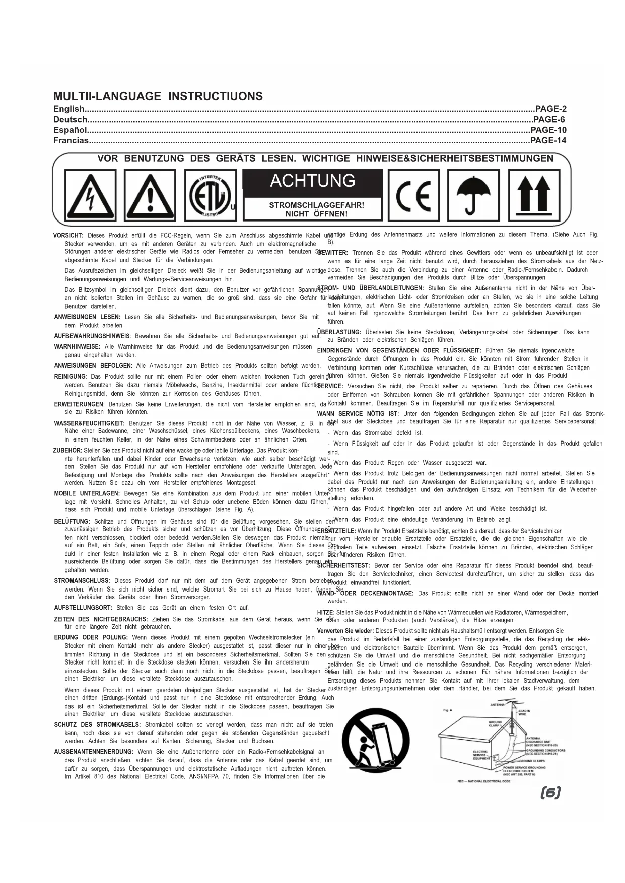 ACHTUNG STROMSCHLAGGEFAHR!NICHT ÖFFNEN!VORSICHT: Dieses Produkt erfüllt die FCC-Regeln, wenn Sie zum Anschluss abgeschirmte Kabel undStecker verwenden, um es mit anderen Geräten zu verbinden. Auch um elektromagnetischeStörungen anderer elektrischer Geräte wie Radios oder Fernseher zu vermeiden, benutzen Sieabgeschirmte Kabel und Stecker für die Verbindungen. D as Ausrufezeichen im gleichseitigen Dreieck weißt Sie in der Bedienungsanleitung auf wichtigeBedienungsanweisungen und Wartungs-/Serviceanweisungen hin.Das Blitzsymbol im gleichseitigen Dreieck dient dazu, den Benutzer vor gefährlichen Spannungenan nicht isolierten Stellen im Gehäuse zu warnen, die so groß sind, dass sie eine Gefahr für denBenutzer darstellen.ANWEISUNGEN LESEN: Lesen Sie alle Sicherheits- und Bedienungsanweisungen, bevor Sie mitdem Produkt arbeiten. A UFBEWAHRUNGSHINWEIS: Bewahren Sie alle Sicherheits- und Bedienungsanweisungen gut auf.WARNHINWEISE: Alle Warnhinweise für das Produkt und die Bedienungsanweisungen müssengenau eingehalten werden. A NWEISUNGEN BEFOLGEN: Alle Anweisungen zum Betrieb des Produkts sollten befolgt werden.REINIGUNG: Das Produkt sollte nur mit einem Polier- oder einem weichen trockenen Tuch gereinigt w erden. Benutzen Sie dazu niemals Möbelwachs, Benzine, Insektenmittel oder andere flüchtigeReinigungsmittel, denn Sie könnten zur Korrosion des Gehäuses führen.ERWEITERUNGEN: Benutzen Sie keine Erweiterungen, die nicht vom Hersteller empfohlen sind, dasie zu Risiken führen könnten.WASSER&FEUCHTIGKEIT: Benutzen Sie dieses Produkt nicht in der Nähe von Wasser, z. B. in derNähe einer Badewanne, einer Waschschüssel, eines Küchenspülbeckens, eines Waschbeckens,in einem feuchten Keller, in der Nähe eines Schwimmbeckens oder an ähnlichen Orten. ZUBEHÖR: Stellen Sie das Produkt nicht auf eine wackelige oder labile Unterlage. Das Produkt kön- nte herunterfallen und dabei Kinder oder Erwachsene verletzen, wie auch selber beschädigt wer-den. Stellen Sie das Produkt nur auf vom Hersteller empfohlene oder verkaufte Unterlagen. JedeBefestigung und Montage des Produkts sollte nach den Anweisungen des Herstellers ausgeführtwerden. Nutzen Sie dazu ein vom Hersteller empfohlenes Montageset.MOBILE UNTERLAGEN: Bewegen Sie eine Kombination aus dem Produkt und einer mobilen Unter-lage mit Vorsicht. Schnelles Anhalten, zu viel Schub oder unebene Böden können dazu führen,dass sich Produkt und mobile Unterlage überschlagen (siehe Fig. A).BELÜFTUNG: Schlitze und Öffnungen im Gehäuse sind für die Belüftung vorgesehen. Sie stellen denzuverlässigen Betrieb des Produkts sicher und schützen es vor Überhitzung. Diese Öffnungen dür-fen nicht verschlossen, blockiert oder bedeckt werden.Stellen Sie deswegen das Produkt niemalsauf ein Bett, ein Sofa, einen Teppich oder Stellen mit ähnlicher Oberfläche. Wenn Sie dieses Pro-dukt in einer festen Installation wie z. B. in einem Regal oder einem Rack einbauen, sorgen Sie fürausreichende Belüftung oder sorgen Sie dafür, dass die Bestimmungen des Herstellers genau eingehalten werden.STROMANSCHLUSS: Dieses Produkt darf nur mit dem auf dem Gerät angegebenen Strom betriebenwerden. Wenn Sie sich nicht sicher sind, welche Stromart Sie bei sich zu Hause haben, fragen Sieden Verkäufer des Geräts oder Ihren Stromversorger.AUFSTELLUNGSORT: Stellen Sie das Gerät an einem festen Ort auf.ZEITEN DES NICHTGEBRAUCHS: Ziehen Sie das Stromkabel aus dem Gerät heraus, wenn Sie esfür eine längere Zeit nicht gebrauchen.ERDUNG ODER POLUNG: Wenn dieses Produkt mit einem gepolten Wechselstromstecker (einStecker mit einem Kontakt mehr als andere Stecker) ausgestattet ist, passt dieser nur in einer bes-timmten Richtung in die Steckdose und ist ein besonderes Sicherheitsmerkmal. Sollten Sie denStecker nicht komplett in die Steckdose stecken können, versuchen Sie ihn andersherumeinzustecken. Sollte der Stecker auch dann noch nicht in die Steckdose passen, beauftragen Sieeinen Elektriker, um diese veraltete Steckdose auszutauschen.Wenn dieses Produkt mit einem geerdeten dreipoligen Stecker ausgestattet ist, hat der Steckereinen dritten (Erdungs-)Kontakt und passt nur in eine Steckdose mit entsprechender Erdung. Auchdas ist ein Sicherheitsmerkmal. Sollte der Stecker nicht in die Steckdose passen, beauftragen Sieeinen Elektriker, um diese veraltete Steckdose auszutauschen.SCHUTZ DES STROMKABELS: Stromkabel sollten so verlegt werden, dass man nicht auf sie tretenkann, noch dass sie von darauf stehenden oder gegen sie stoßenden Gegenständen gequetschtwerden. Achten Sie besonders auf Kanten, Sicherung, Stecker und Buchsen.AUSSENANTENNENERDUNG: Wenn Sie eine Außenantenne oder ein Radio-/Fernsehkabelsignal andas Produkt anschließen, achten Sie darauf, dass die Antenne oder das Kabel geerdet sind, umdafür zu sorgen, dass Überspannungen und elektrostatische Aufladungen nicht auftreten können.Im Artikel 810 des National Electrical Code, ANSI/NFPA 70, finden Sie Informationen über dierichtige Erdung des Antennenmasts und weitere Informationen zu diesem Thema. (Siehe Auch Fig. B). GEWITTER: Trennen Sie das Produkt während eines Gewitters oder wenn es unbeaufsichtigt ist oder w enn es für eine lange Zeit nicht benutzt wird, durch herausziehen des Stromkabels aus der Netz- d ose. Trennen Sie auch die Verbindung zu einer Antenne oder Radio-/Fernsehkabeln. Dadurchvermeiden Sie Beschädigungen des Produkts durch Blitze oder Überspannungen.STROM- UND ÜBERLANDLEITUNGEN: Stellen Sie eine Außenantenne nicht in der Nähe von Über- l andleitungen, elektrischen Licht- oder Stromkreisen oder an Stellen, wo sie in eine solche Leitung f allen könnte, auf. Wenn Sie eine Außenantenne aufstellen, achten Sie besonders darauf, dass Sieauf keinen Fall irgendwelche Stromleitungen berührt. Das kann zu gefährlichen Auswirkungenführen.ÜBERLASTUNG: Überlasten Sie keine Steckdosen, Verlängerungskabel oder Sicherungen. Das kannzu Bränden oder elektrischen Schlägen führen.E