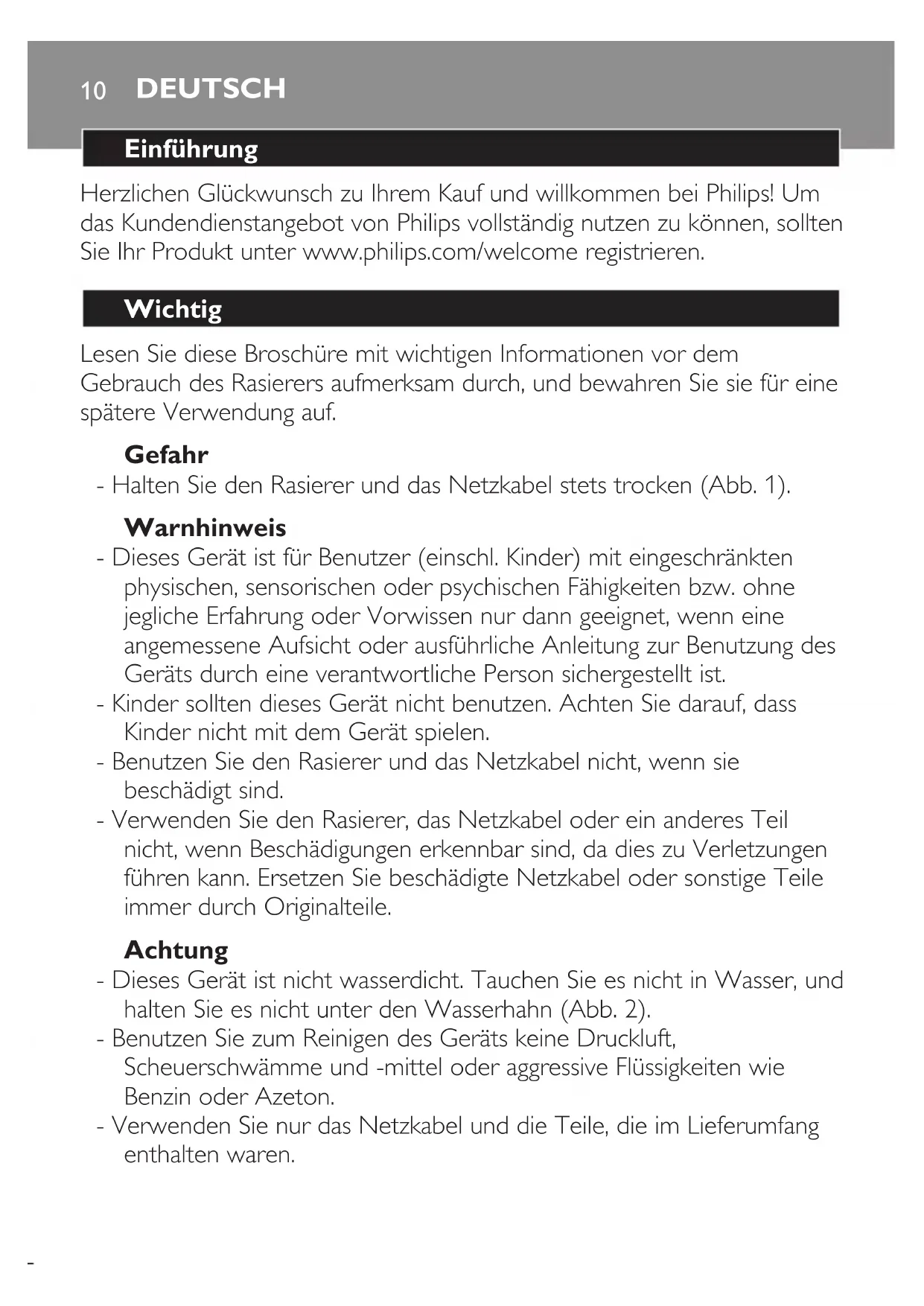 - Halten Sie den Rasierer und das Netzkabel stets trocken (Abb. 1).