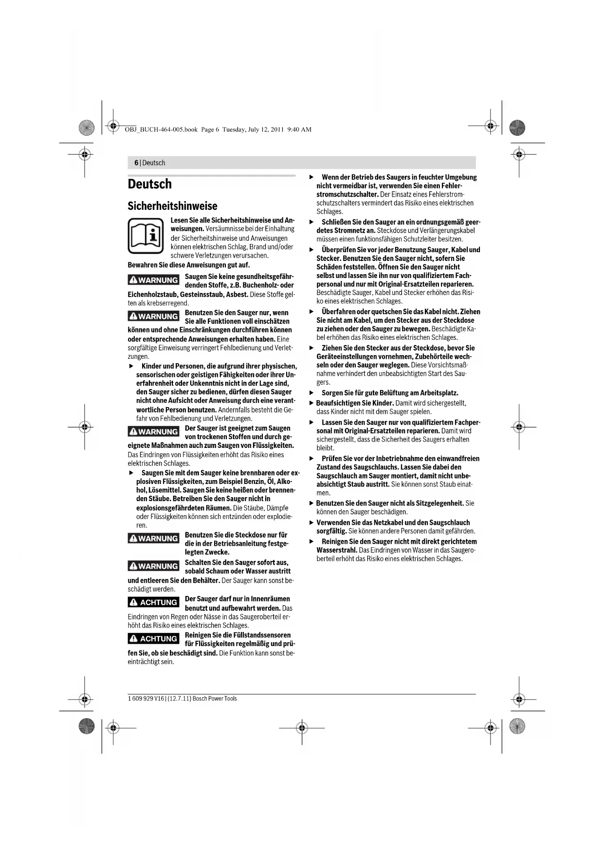 OBJ_BUCH-464-005.book Page 9 Tuesday, July 12, 2011 9:40 AM10 | English 1 609 929 V16 | (12.7.11) Bosch Power ToolsRegelmäßiges Entleeren gewährleistet optimale Saugleistung.Wird die Saugleistung danach nicht erreicht, ist der Sauger dem Kundendienst zuzuführen. Kundendienst und Kundenberatung Der Kundendienst beantwortet Ihre Fragen zu Reparatur und Wartung Ihres Produkts sowie zu Ersatzteilen. Explosions-zeichnungen und Informationen zu Ersatzteilen finden Sie auch unter:www.bosch-pt.comDas Bosch-Kundenberater-Team hilft Ihnen gerne bei Fragen zu Kauf, Anwendung und Einstellung von Produkten und Zu-behören.www.powertool-portal.de, das Internetportal für Handwer-ker und Heimwerker.www.ewbc.de, der Informations-Pool für Handwerk und Aus-bildung.DeutschlandRobert Bosch GmbHServicezentrum ElektrowerkzeugeZur Luhne 237589 Kalefeld – WillershausenTel. Kundendienst: +49 (1805) 70 74 10*Fax: +49 (1805) 70 74 11*(*Festnetzpreis 14 ct/min, höchstens 42 ct/min aus Mobil-funknetzen)E-Mail: Servicezentrum.Elektrowerkzeuge@de.bosch.comTel. Kundenberatung: +49 (1803) 33 57 99(Festnetzpreis 9 ct/min, höchstens 42 ct/min aus Mobilfunk-netzen)Fax: +49 (711) 7 58 19 30E-Mail: kundenberatung.ew@de.bosch.comÖsterreichTel.: +43 (01) 7 97 22 20 10Fax: +43 (01) 7 97 22 20 11E-Mail: service.elektrowerkzeuge@at.bosch.comSchweizTel.: +41 (044) 8 47 15 11Fax: +41 (044) 8 47 15 51LuxemburgTel.: +32 (070) 22 55 65Fax: +32 (070) 22 55 75E-Mail: outillage.gereedschap@be.bosch.com Entsorgung Sauger, Zubehör und Verpackungen sollen einer umweltge-rechten Wiederverwertung zugeführt werden.Werfen Sie den Sauger nicht in den Hausmüll!Nur für EU-Länder:Gemäß der Europäischen Richtlinie 2002/96/EG über Elektro- und Elektronik-Altgeräte und ihrer Umsetzung in nationales Recht müssen nicht mehr gebrauchsfähige Elektrowerkzeuge getrennt gesammelt und einer umweltgerechten Wiederverwertung zugeführt werden.Änderungen vorbehalten. English
