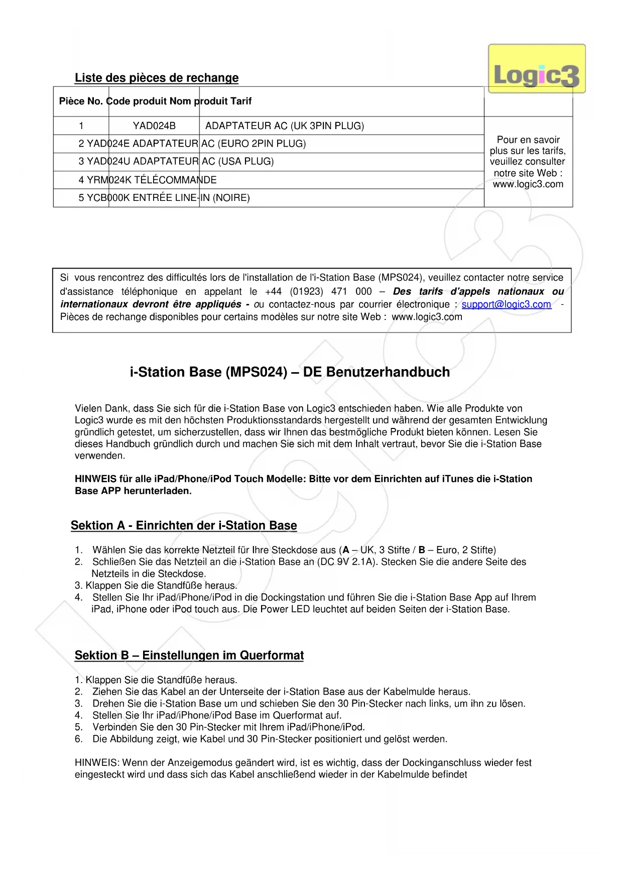 5 YCB000K ENTRÉE LINE-IN (NOIRE) i-Station Base (MPS024) – DE Benutzerhandbuch Vielen Dank, dass Sie sich für die i-Station Base von Logic3 entschieden haben. Wie alle Produkte von Logic3 wurde es mit den höchsten Produktionsstandards hergestellt und während der gesamten Entwicklung gründlich getestet, um sicherzustellen, dass wir Ihnen das bestmögliche Produkt bieten können. Lesen Sie dieses Handbuch gründlich durch und machen Sie sich mit dem Inhalt vertraut, bevor Sie die i-Station Base verwenden. HINWEIS für alle iPad/Phone/iPod Touch Modelle: Bitte vor dem Einrichten auf iTunes die i-Station Base APP herunterladen. Sektion A - Einrichten der i-Station Base