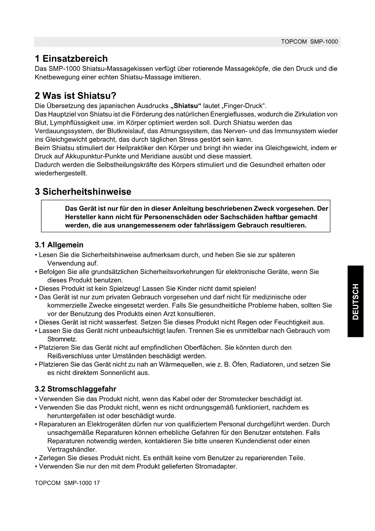 - Falls Sie therapeutische Fragen in Hinblick auf den Gebrauch des Massagegeräts haben, sollten Sie Ihren Arzt konsultieren.TOPCOM SMP-1000 19 TOPCOM SMP-1000 DEUTSCH