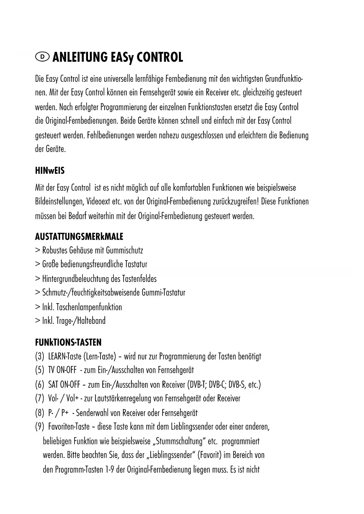 Batterien gehören nicht in den Hausmüll! Geben Sie verbrauchte Batterien bei Ihrer Batteriesam- melstelle oder dem Fachhändler ab! Um ein Auslaufen der Batterien zu verhindern, entfernen sie die Batterien falls das Gerät über längere Zeit nicht verwendet werden soll. ACHTUNG > Batterien nicht kurzschließen > Aufladbare Batterien dürfen nur unter Aufsicht von Erwachsenen geladen werden > Aufladbare Batterien müssen vor dem Ladevorgang aus dem Gerät genommen werden > Nicht aufladbare Batterien dürfen nicht geladen werden > Ausgelaufene Batterien müssen umgehend aus dem Gerät entfernt werden > Keine unterschiedlichen Batterietypen oder Batterien mit unterschiedlichen Ladezuständen miteinander mischen > Verpackung und Anleitung aufbewahren, da diese wichtige Informationen enthalten INSTRUCTIONS EASy CONTROL The Easy control is a learning multifunctional remote control with the most important basic functions. The Easy Control can replace 2 original remote controls. It´s possible to control the TV and the receiver etc. with only one remote control. NOTE With the Easy Control it is not possible to control all comfortable functions like Videotext etc. For this functions it‘s still necessary to use the original remote control. FEATURES > Robust case with rubber protector > User friendly keyboard > Backlight function > Dirt humidity firm keyboard > Incl. torch function > Incl. holding strap