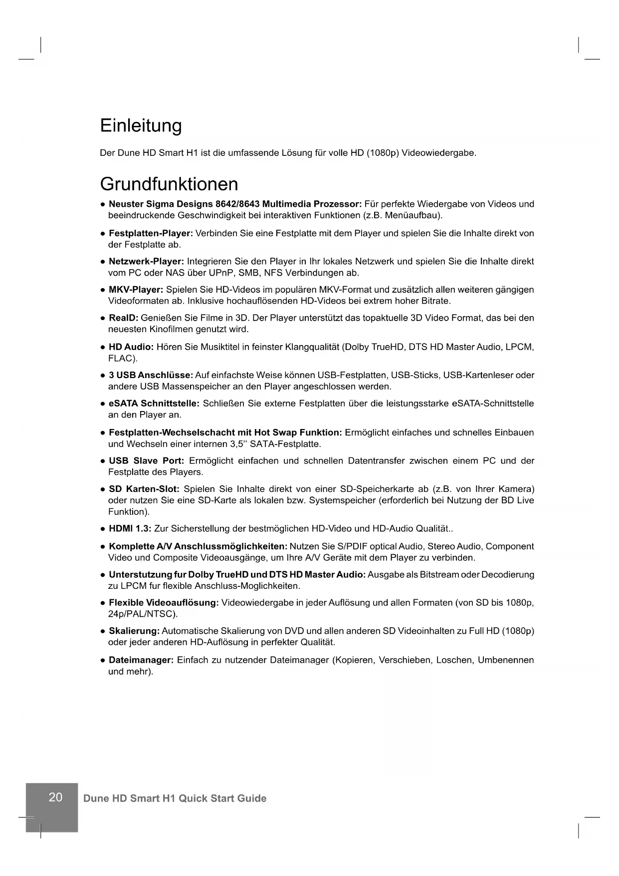 Sehen Sie nun ein Bild auf dem TV, drücken Sie bitte die "ENTER" Taste der Fernbedienung und wechseln bei Bedarf in das Video Setup Menü, um weitere Feinheiten der Videodarstellung zu konfi gurieren. HINWEIS: Der Schnellwechsel des Video-Modus funktioniert nicht bei der Wiedergabe von Inhalten. Um diese Funktion zu nutzen, schalten Sie den Player aus und warten etwa 1 Minute, bis der Player wieder voll betriebsbereit ist.25 Interne Festplatte nutzen Zum Einlegen einer internen 3,5” SATA-Festplatte wechseln Sie bitte zunächst in das Hauptmenü. Öffnen Sie das Schubfach des Festplatten-Racks, legen Sie die Festplatte in den Schacht und schließen Sie das Schubfach. Der Player erkennt die interne Festplatte und es erscheint der entsprechende Menüpunkt im Hauptmenü. Nehmen Sie die interne Festplatte nicht heraus während noch Daten geschrieben werden! Wir empfehlen die Verwendung „grüner“ Festplatten mit einem geringen RPM-Wert, geringer Wärmeemission und geringem Stromverbrauch; weitere Informationen über kompatible Festplatten fi nden Sie unter: http://dune-hd.com/support/hw_compat/ USB-Geräte anschließen Zum Einbinden von USB-Geräten wechseln Sie bitte zunächst in das Hauptmenü. Nach Anstecken des USB-Gerätes wird dieses vom Player erkannt und es erscheint der entsprechende Menüpunkt auf dem Bildschirm. Bei Verwendung eines externen USB-Laufwerks mit hohem Strombedarf (z.B. Festplatte), nutzen Sie bitte eine externe Stromversorgung für das Gerät. Die Ausgangsspannung für das Gerät über den USB-Port kann zu gering sein und somit das Gerät nicht funktionieren. Entfernen Sie kein externes Gerät vom USB-Anschluss während noch Daten geschrieben werden! SD Speicherkarten verwenden Zum Einlegen einer SD-Karte wechseln Sie bitte zunächst in das Hauptmenü. Schieben Sie die Speicherkarte in den SD Kartenslot am Player. Der Player erkennt die Speicherkarte und es erscheint der entsprechende Menüpunkt im Hauptmenü. Manche SD-Karten werden vom Player evtl. nicht erkannt bzw. funktionieren nicht richtig. Bitte verwenden Sie in diesem Fall eine andere SD-Karte. Entfernen Sie die Speicherkarte nicht während noch Daten geschrieben werden! eSATA Laufwerke anschließen Um ein eSATA Laufwerk anzuschließen, schalten Sie bitte beide Geräte zunächst aus! Verbinden Sie nun das eSATA Laufwerk mit dem eSATA-Anschluss des Players und schließen die externe Stromversorgung des eSATA Laufwerks an das Laufwerk an. Schalten Sie nun zuerst das eSATA Laufwerk, und im Anschluss den Player ein. Das eSATA Laufwerk wird nun vom Player erkannt und es erscheint der entsprechende Menüpunkt auf dem Bildschirm. Entfernen oder schalten Sie das eSATA Laufwerk nur aus, nachdem der Player ausgeschaltet wurde. USB Slave Funktion nutzen Um den Player mit eingebauter interner Festplatte über USB Slave anzuschließen, schalten Sie den Player zunächst aus. Verbinden Sie nun den USB Slave-Anschluss des Players mit dem USB Host-Anschluss am PC. Schalten Sie den Player wieder an. Der Player wird vom PC als neues USB-Gerät erkannt und kann nun mit Daten beladen werden. Zum sicheren Entfernen des Players nutzen Sie am PC den Befehl „Hardware sicher entfernen“ oder eine ähnliche Funktion, schalten Sie den Player aus und entfernen dann das Kabel vom USB Slave-Anschluss des Players und vom USB Host-Anschluss des PCs. Netzwerkfreigaben einbinden Um eine Netzwerkfreigabe mittels SMB oder NFS(Linux) einzubinden, wechseln Sie bitte zunächst ins Hauptmenü. Drücken Sie dort nun die «MENU» Taste der Fernbedienung und wählen «Netzwerkordner erstellen». Geben Sie nun alle benötigten Parameter für die Netzwerkfreigabe über die Fernbedienung ein. Im Anschluss erscheint im Hauptmenü dann ein neuer Menüpunkt mit der von Ihnen erstellten Netzwerkverbindung. Deutsch26 Dune HD Smart H1 Quick Start Guide Um alle verfügbaren SMB oder UPnP Netzwerk Ressourcen anzuzeigen, wählen Sie bitte den Menüpunkt «Network Browser» im Hauptmenü des Players. HINWEIS: Sollten nicht alle verfügbaren Netzwerk Ressourcen angezeigt werden, warten Sie bitte einige Minuten oder drücken nochmals die «MENU» Taste der Fernbedienung und wählen «Refresh». Festplatte formatieren Zum Formatieren einer Festplatte, die an den Player angeschlossen ist, wählen Sie im Hauptmenü das Laufwerk aus, drücken die INFO-Taste auf der Fernbedienung und wählen entweder den Befehl „Festplatte formatieren“ (zum Formatieren der gesamten Festplatte) oder den Befehl „Partition Formatieren“ (zum Formatieren einer bestehenden Partition). Der Player formatiert die Festplatte mit dem EXT2-Dateisystem. HINWEIS: Wenn Sie Festplatten, die mit dem Player formatiert wurden, an einem Windows PC verwenden möchten, müssen Sie evtl. zusätzliche Software am PC installieren, wie z.B. «EXT2FSD» (http://www. ext2fsd.com/). Player ein-/ und ausschalten Um den Player einzuschalten bringen Sie den Schalter auf der Geräterückseite in die Position „Ein“ und drücken Sie die POWER-Taste auf der Fernbedienung oder den POWER-Knopf vorne am Player. Um den Player in den Standby Modus zu versetzen, drücken Sie die «POWER» Taste auf der Fernbedienung oder den POWER-Knopf vorne am Player. Zum Beenden des Standby Modus drücken Sie bitte erneut eine der genannten Tasten. In den Player-Einstellungen (siehe Setup-Menü) können Sie zwischen zwei verschiedenen Standby-Modi wählen: dem „Hardware Standby“ Modus oder dem „Software Standby“ Modus. Im „Hardware Standby“ Modus ist das Gerät fast komplett ausgeschaltet und der Player verbraucht fast keinen Strom. Im „Software Standby“ Modus erzeugt der Player kein Videosignal mehr, ist aber trotzdem noch voll betriebsbereit. Z.B. Können Sie weitere am Gerät angeschlossene Geräte über die NAS-Funktion des Players ansprechen und nutzen. Das Beenden des „Software Standby“ dauert nur wenige Sekunden. Im „Software Standby“ Zustand benötigt der Player signifi kant Strom. Wir empfe
