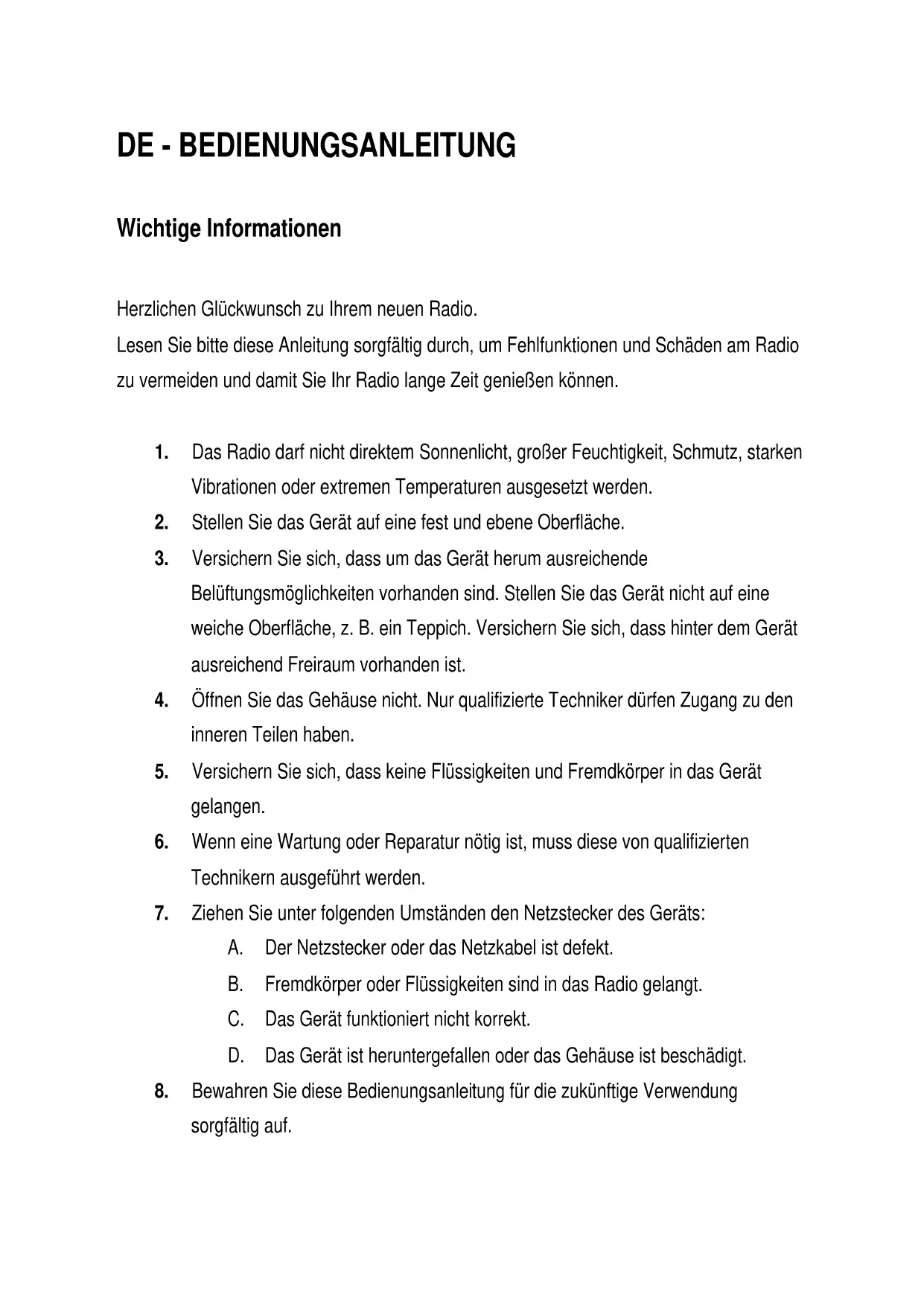 1. Das Radio darf nicht direktem Sonnenlicht, großer Feuchtigkeit, Schmutz, starken