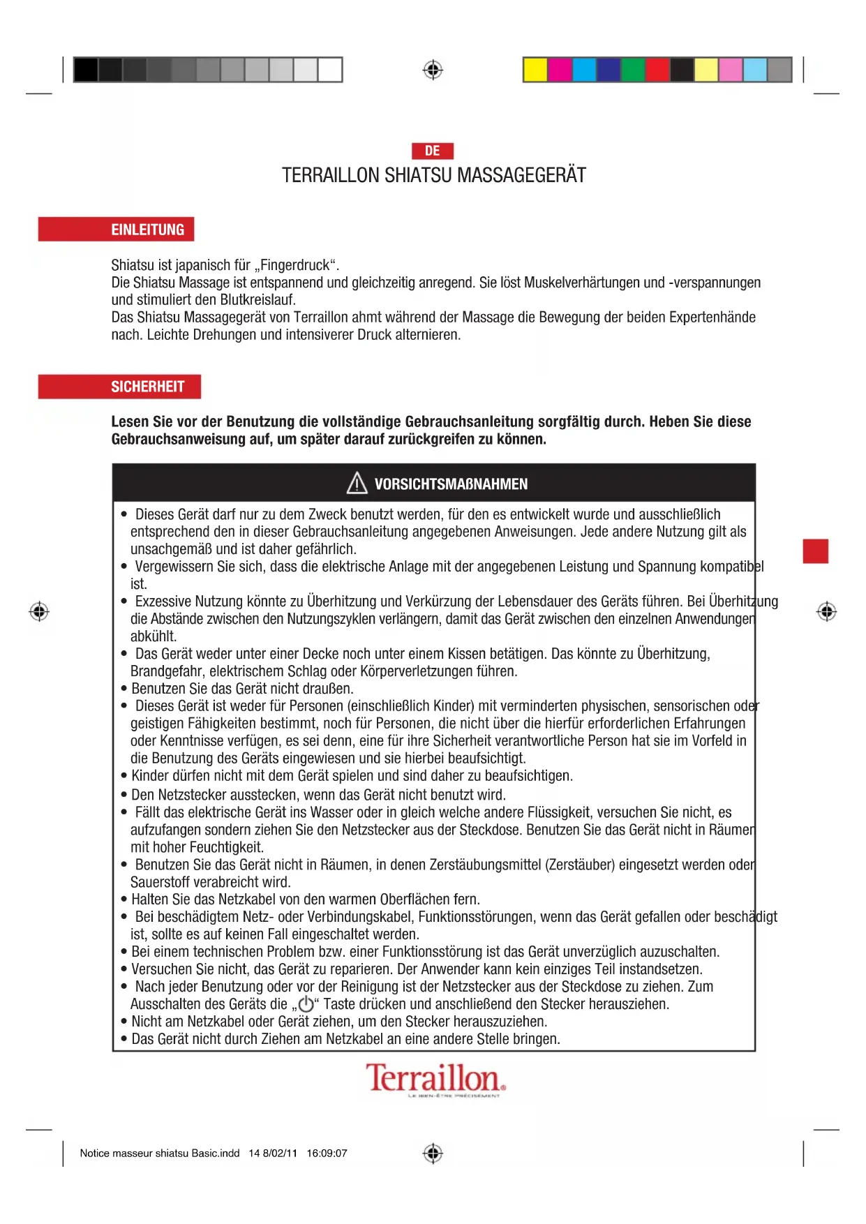 Notice masseur shiatsu Basic.indd 13 8/02/11 16:09:07TERRAILLON SHIATSU MASSAGEGERÄT DE EINLEITUNG Shiatsu ist japanisch für „Fingerdruck“.