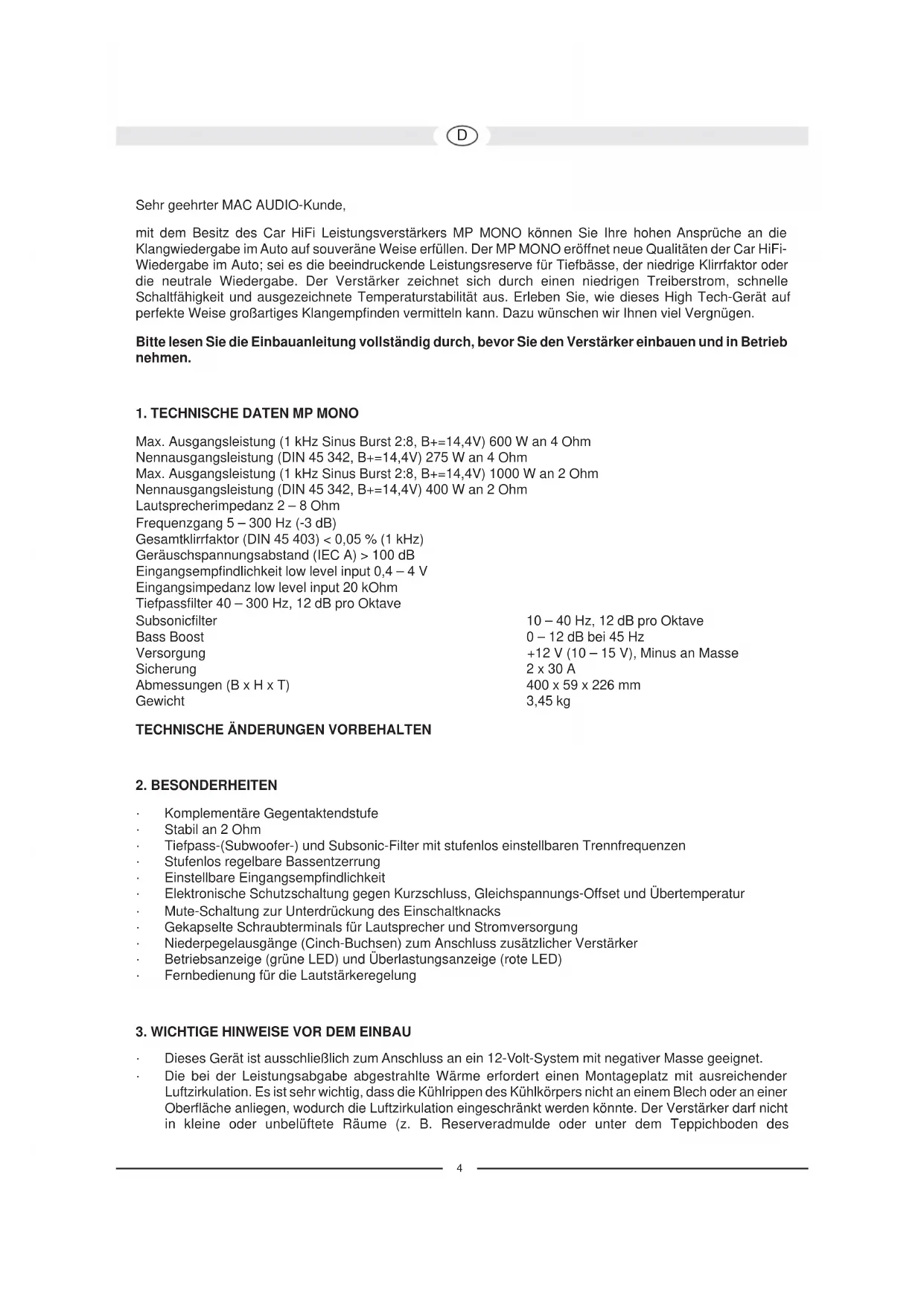 Sehr geehrter MAC AUDIO-Kunde, mit dem Besitz des Car HiFi Leistungsverstärkers MP MONO können Sie Ihre hohen Ansprüche an die Klangwiedergabe im Auto auf souveräne Weise erfüllen. Der MP MONO eröffnet neue Qualitäten der Car HiFi- Wiedergabe im Auto; sei es die beeindruckende Leistungsreserve für Tiefbässe, der niedrige Klirrfaktor oder die neutrale Wiedergabe. Der Verstärker zeichnet sich durch einen niedrigen Treiberstrom, schnelle Schaltfähigkeit und ausgezeichnete Temperaturstabilität aus. Erleben Sie, wie dieses High Tech-Gerät auf perfekte Weise großartiges Klangempfinden vermitteln kann. Dazu wünschen wir Ihnen viel Vergnügen. Bitte lesen Sie die Einbauanleitung vollständig durch, bevor Sie den Verstärker einbauen und in Betrieb nehmen.