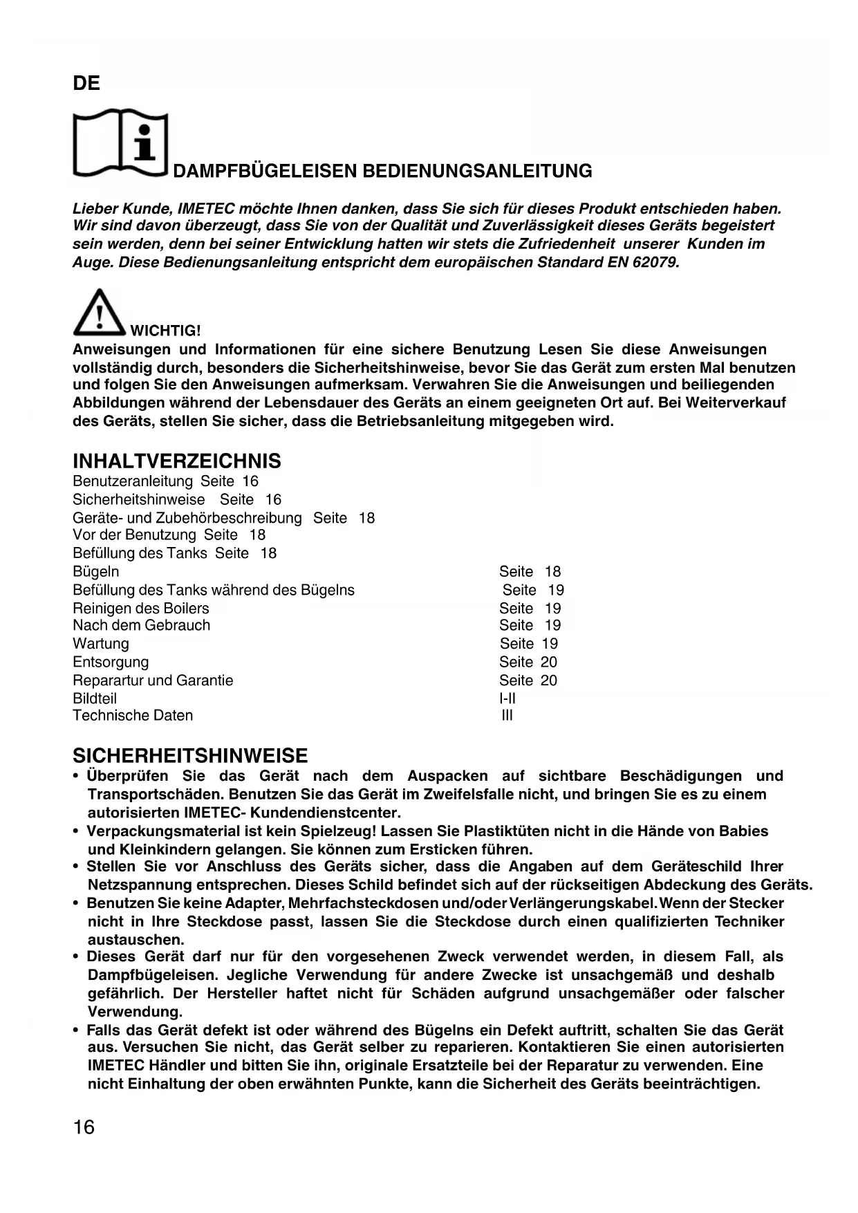 DAMPFBÜGELEISEN BEDIENUNGSANLEITUNG Lieber Kunde, IMETEC möchte Ihnen danken, dass Sie sich für dieses Produkt entschieden haben.
