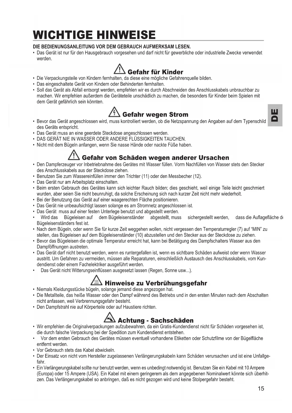 - Wir übernehmen keine Haftung bei einem falschen oder in dieser Anleitung nicht vorgesehenen Einsatz des Bügeleisens.