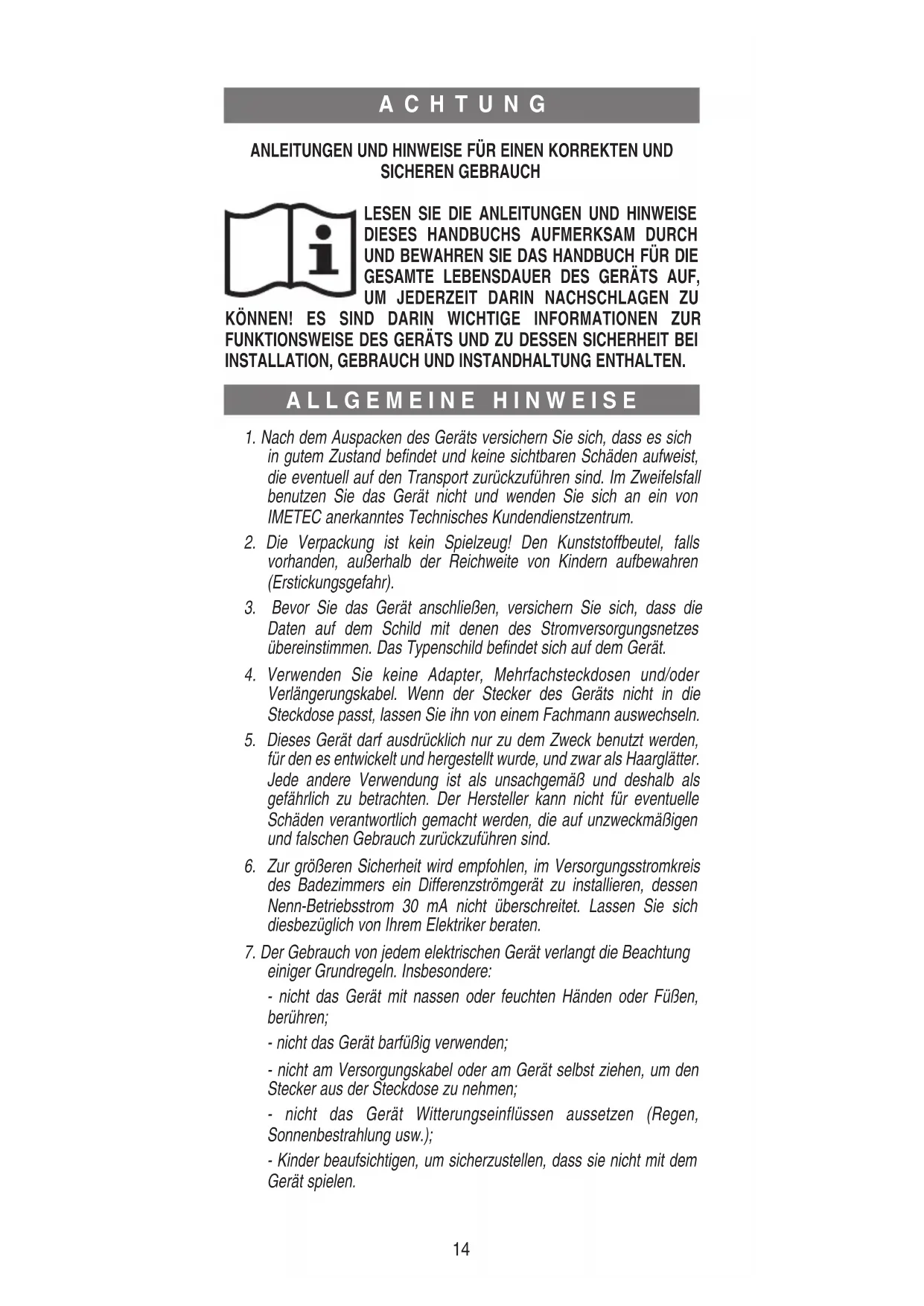 ACHTUNG ALLGEMEINE HINWEISE ANLEITUNGEN UND HINWEISE FÜR EINEN KORREKTEN UND SICHEREN GEBRAUCH LESEN SIE DIE ANLEITUNGEN UND HINWEISE DIESES HANDBUCHS AUFMERKSAM DURCH UND BEWAHREN SIE DAS HANDBUCH FÜR DIE GESAMTE LEBENSDAUER DES GERÄTS AUF,