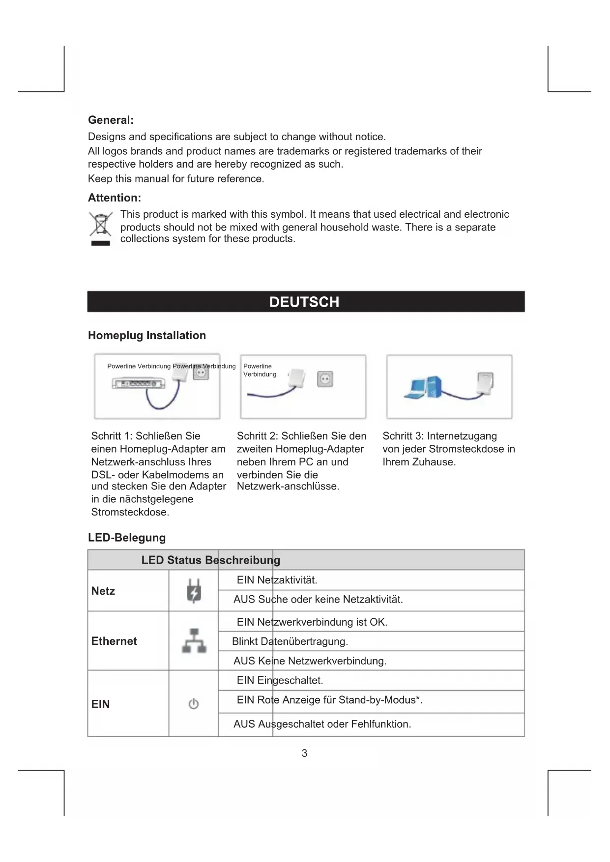 - Stand-by-Modus: Dies ist der Energiesparmodus entsprechend EuP-Normen. Der Homeplug-Adapter begibt sich automatisch in den Stand-by-Modus, wenn das Netzwerk nicht aktiv ist. Sicherheitsvorkehrungen: Um das Risiko eines elektrischen Schlags zu verringern, sollte dieses Produkt AUSSCHLIESSLICH von einem autorisierten Techniker geöffnet werden. Bei Problemen trennen Sie das Gerät bitte von der Spannungsversorgung und von anderen Geräten ab. Stellen Sie sicher, dass das Gerät nicht mit Wasser oder Feuchtigkeit in Berührung kommt. Wartung: Nur mit einem trockenen Tuch säubern. Keine Reinigungs- oder Scheuermittel verwenden. Garantie: Es kann keine Garantie oder Haftung für irgendwelche Änderungen oder Modikationen des Produkts oder für Schäden übernommen werden, die aufgrund einer nicht ordnungsgemäßen Anwendung des Produkts entstanden sind. Allgemeines: Design und technische Daten können ohne vorherige Ankündigung geändert werden. Alle Logos, Marken und Produktnamen sind Marken oder eingetragene Marken ihrer jeweiligen Eigentümer und werden hiermit als solche anerkannt. Bitte bewahren Sie Bedienungsanleitung und Verpackung für spätere Verwendung auf. Achtung: Dieses Produkt ist mit diesem Symbol gekennzeichnet. Es bedeutet, dass die ausgedienten elektrischen und elektronischen Produkte nicht mit dem allgemeinen Haushaltsmüll entsorgt werden dürfen. Für diese Produkte stehen gesonderte Sammelsysteme zur Verfügung. FRANÇAIS Installation de ches de protection Powerline Bridge Powerline Bridge Powerline Bridge Étape 1 : Raccordez un adaptateur de courant à un connecteur Ethernet de votre modem ADSL ou câble puis raccordez l’adaptateur à la prise de courant la plus proche Étape 2 : Raccordez le second adaptateur de courant à une prise de courant proche de votre ordinateur puis raccordez l’autre extrémité à un connecteur Ethernet Étape 3 : Vous pouvez accéder à Internet depuis toutes les prises de courant de votre domicile STROMSCHLAGGEFAHRNICHT ÖFFNEN VORSICHT5 Présentation des différents témoins DEL DEL Etat Description Alimentation ALLUME Transfert de données. ETEINT Recherche ou aucun transfert de données en cours. Ethernet ALLUME La connexion Ethernet est normale. Clignote Transfert de données en cours. ETEINT Aucune liaison Ethernet. ALIMENTATION ALLUME Sous tension. ALLUME Le témoin rouge indique que le mode Attente est activé* ETEINT Erreur ou désactivé.
