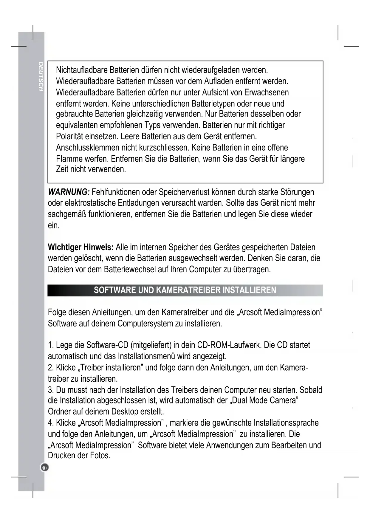 SOFTWARE UND KAMERATREIBER INSTALLIEREN Folge diesen Anleitungen, um den Kameratreiber und die „Arcsoft MediaImpression”