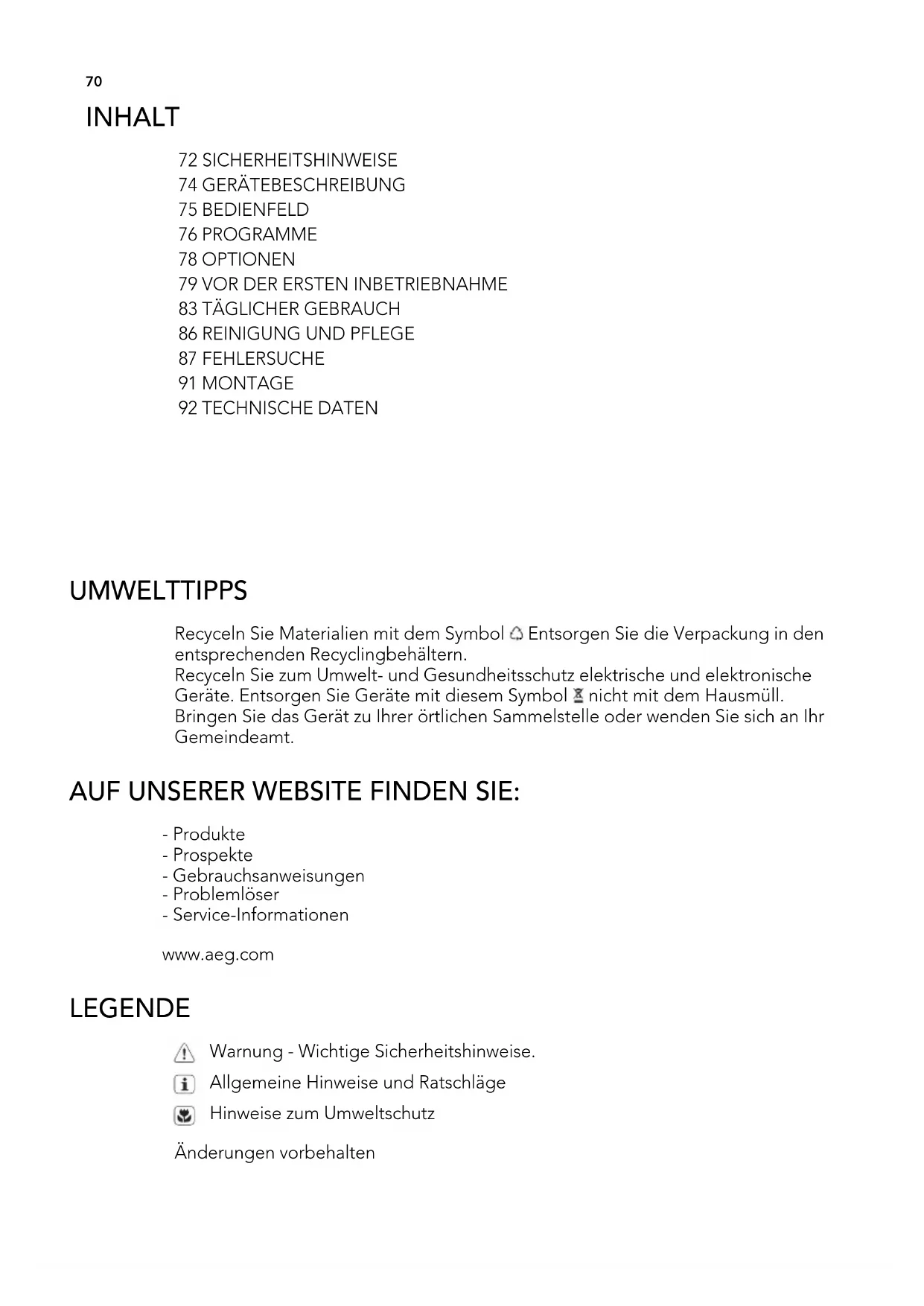 70FÜR PERFEKTE ERGEBNISSE Danke, dass Sie sich für dieses AEG Produkt entschieden haben. Wir haben es