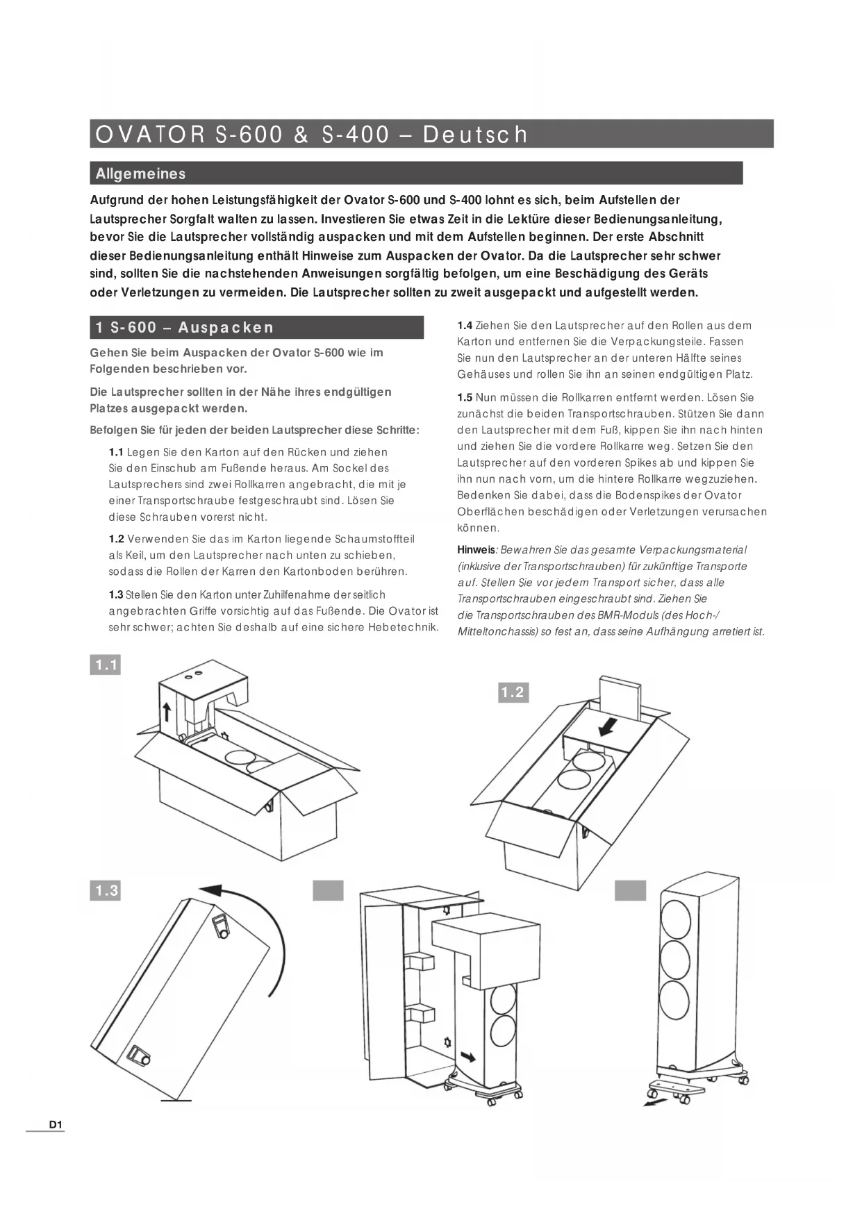ENGLISH, DEUTSCH, F R A N Ç A I S , I T A L I A N O , ESPAñOL, NEDERLANDS, 中文D1 OVATOR S-600 & S-400 – Deutsch Allgemeines Aufgrund der hohen Leistungsfähigkeit der Ovator S-600 und S-400 lohnt es sich, beim Aufstellen der Lautsprecher Sorgfalt walten zu lassen. Investieren Sie etwas Zeit in die Lektüre dieser Bedienungsanleitung, bevor Sie die Lautsprecher vollständig auspacken und mit dem Aufstellen beginnen. Der erste Abschnitt dieser Bedienungsanleitung enthält Hinweise zum Auspacken der Ovator. Da die Lautsprecher sehr schwer sind, sollten Sie die nachstehenden Anweisungen sorgfältig befolgen, um eine Beschädigung des Geräts oder Verletzungen zu vermeiden. Die Lautsprecher sollten zu zweit ausgepackt und aufgestellt werden. 1 S-600 – Auspacken Gehen Sie beim Auspacken der Ovator S-600 wie im Folgenden beschrieben vor. Die Lautsprecher sollten in der Nähe ihres endgültigen Platzes ausgepackt werden. Befolgen Sie für jeden der beiden Lautsprecher diese Schritte: 1.1 Legen Sie den Karton auf den Rücken und ziehen Sie den Einschub am Fußende heraus. Am Sockel des Lautsprechers sind zwei Rollkarren angebracht, die mit je einer Transportschraube festgeschraubt sind. Lösen Sie diese Schrauben vorerst nicht. 1.2 Verwenden Sie das im Karton liegende Schaumstoffteil als Keil, um den Lautsprecher nach unten zu schieben, sodass die Rollen der Karren den Kartonboden berühren.1.3 Stellen Sie den Karton unter Zuhilfenahme der seitlich angebrachten Griffe vorsichtig auf das Fußende. Die Ovator ist sehr schwer; achten Sie deshalb auf eine sichere Hebetechnik. 1.4 Ziehen Sie den Lautsprecher auf den Rollen aus dem Karton und entfernen Sie die Verpackungsteile. Fassen Sie nun den Lautsprecher an der unteren Hälfte seines Gehäuses und rollen Sie ihn an seinen endgültigen Platz. 1.5 Nun müssen die Rollkarren entfernt werden. Lösen Sie zunächst die beiden Transportschrauben. Stützen Sie dann den Lautsprecher mit dem Fuß, kippen Sie ihn nach hinten und ziehen Sie die vordere Rollkarre weg. Setzen Sie den Lautsprecher auf den vorderen Spikes ab und kippen Sie ihn nun nach vorn, um die hintere Rollkarre wegzuziehen. Bedenken Sie dabei, dass die Bodenspikes der Ovator Oberflächen beschädigen oder Verletzungen verursachen können. Hinweis: Bewahren Sie das gesamte Verpackungsmaterial (inklusive der Transportschrauben) für zukünftige Transporte auf. Stellen Sie vor jedem Transport sicher, dass alle Transportschrauben eingeschraubt sind. Ziehen Sie die Transportschrauben des BMR-Moduls (des Hoch-/Mitteltonchassis) so fest an, dass seine Aufhängung arretiert ist.
