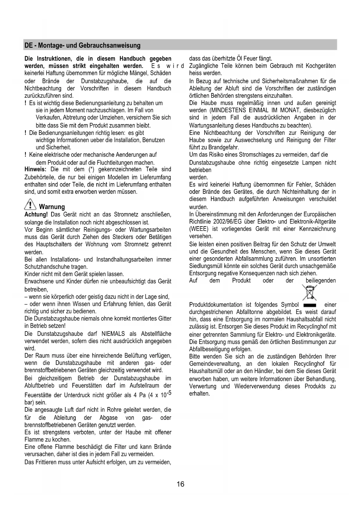 Die Dunstabzugshaube niemals ohne korrekt montiertes Gitter