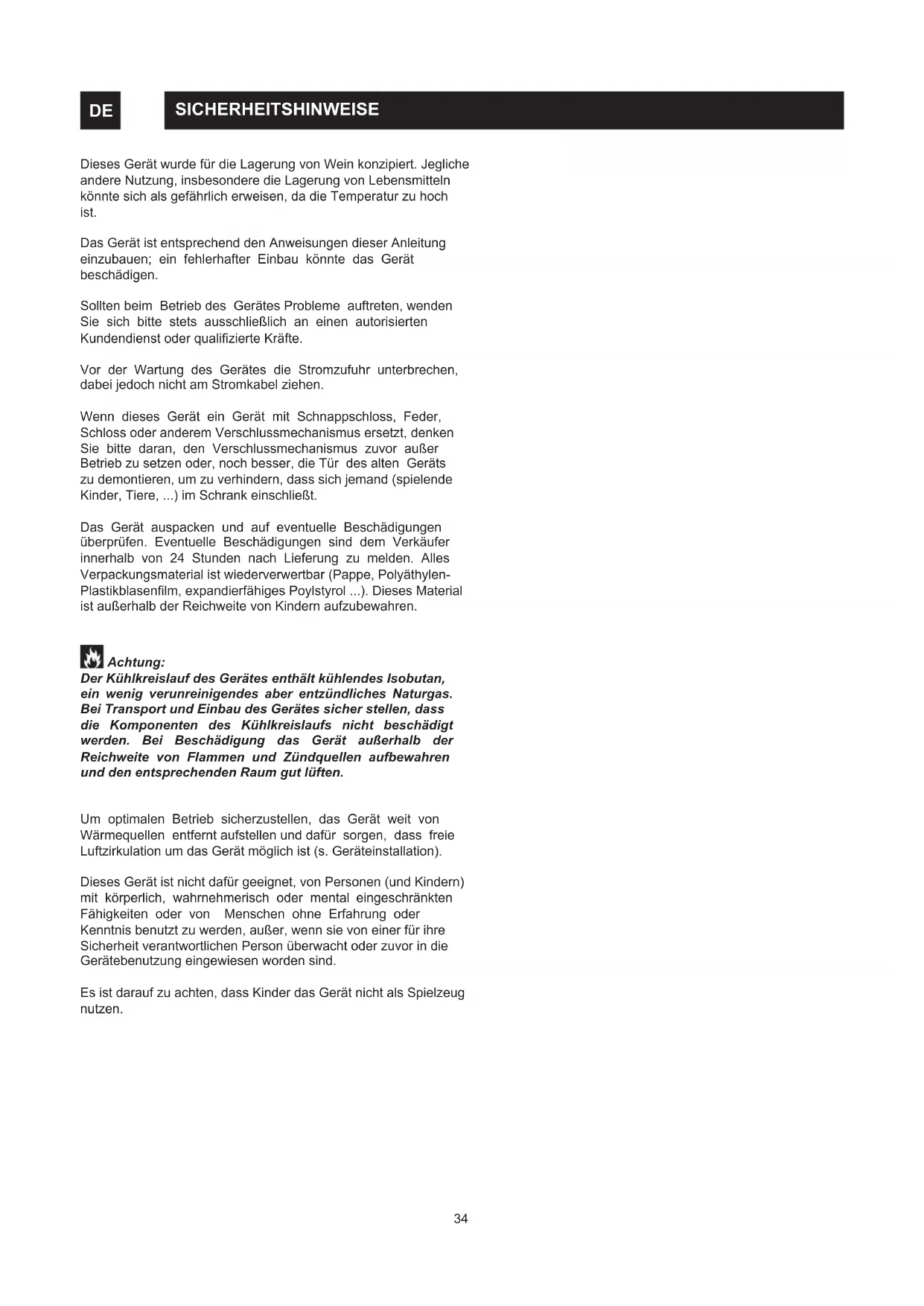 SICHERHEITSHINWEISE DE Dieses Gerät wurde für die Lagerung von Wein konzipiert. Jegliche