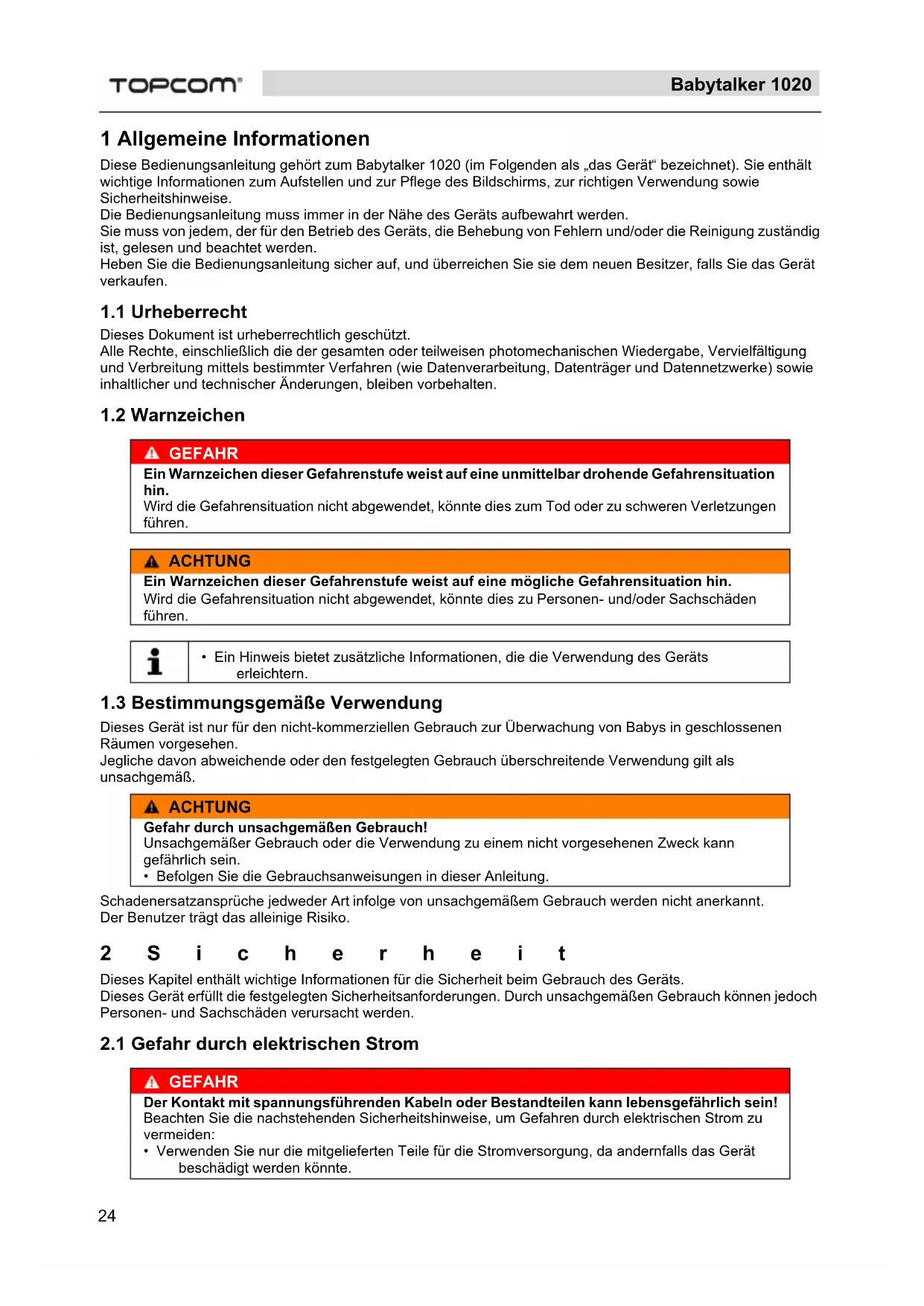 1 Allgemeine Informationen Diese Bedienungsanleitung gehört zum Babytalker 1020 (im Folgenden als „das Gerät“ bezeichnet). Sie enthält wichtige Informationen zum Aufstellen und zur Pflege des Bildschirms, zur richtigen Verwendung sowie Sicherheitshinweise. Die Bedienungsanleitung muss immer in der Nähe des Geräts aufbewahrt werden. Sie muss von jedem, der für den Betrieb des Geräts, die Behebung von Fehlern und/oder die Reinigung zuständig ist, gelesen und beachtet werden. Heben Sie die Bedienungsanleitung sicher auf, und überreichen Sie sie dem neuen Besitzer, falls Sie das Gerät verkaufen.