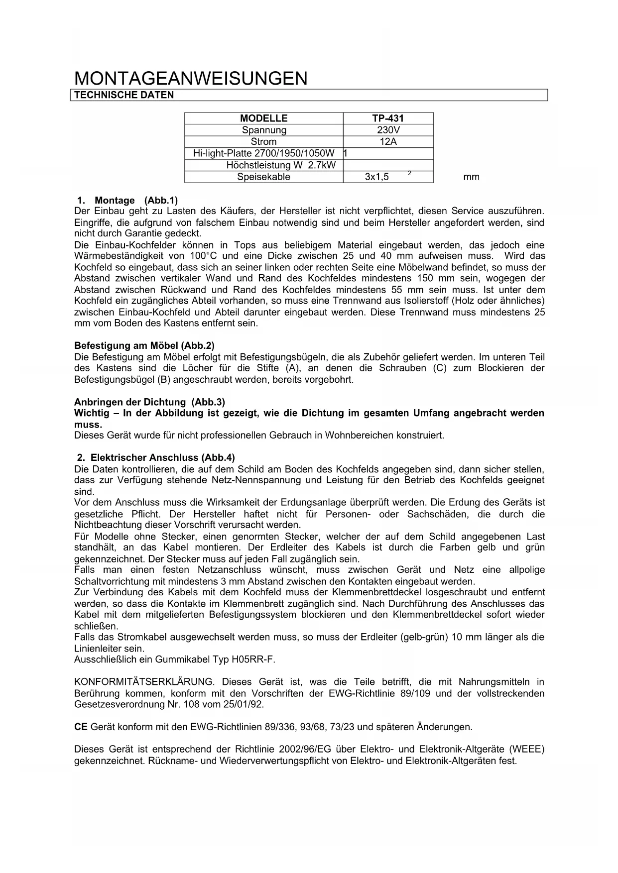 gekennzeichnet. Rückname- und Wiederverwertungspflicht von Elektro- und Elektronik-Altgeräten fest.BEDIENUNGSANWEISUNGEN Wichtig: Vor dem ersten Kochen muss das Kochfeld gereinigt werden, danach alle Heizelemente