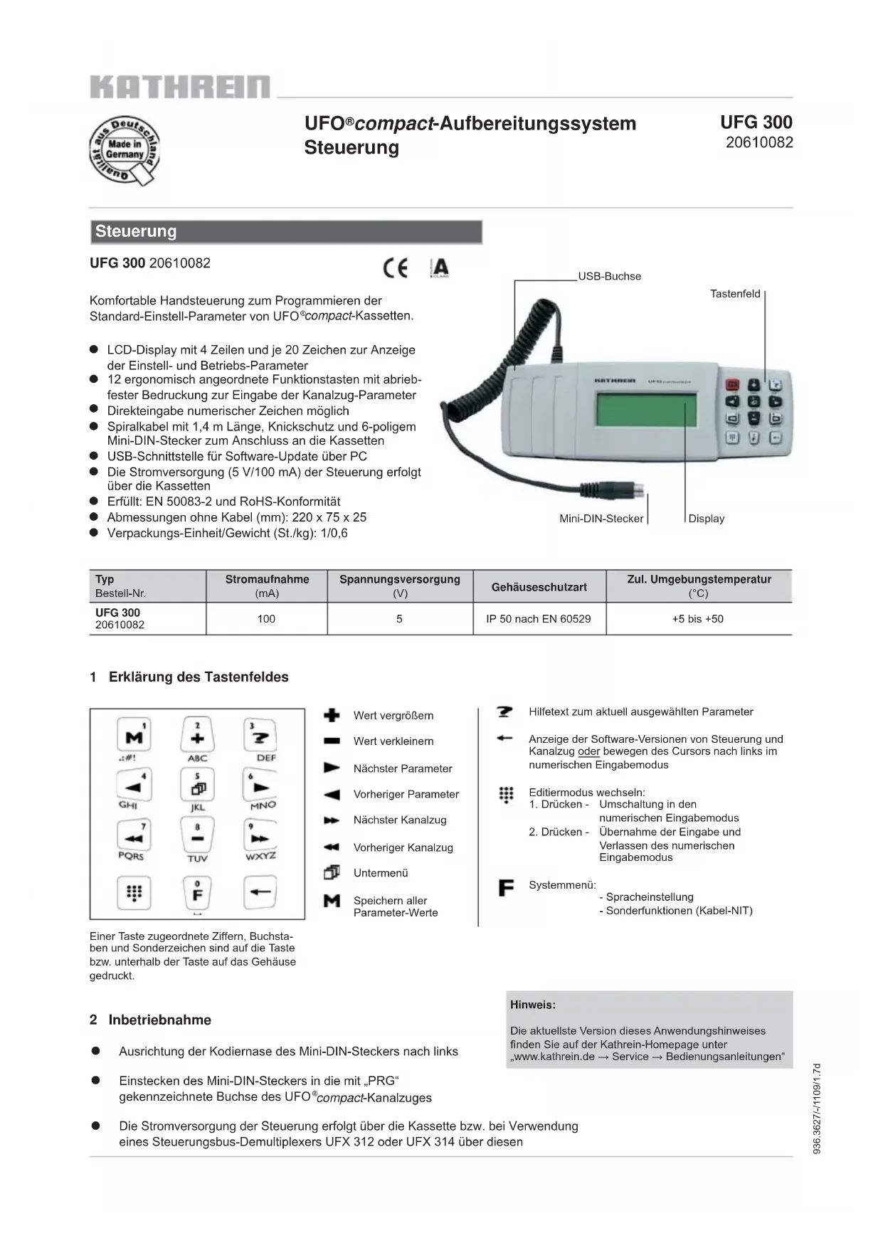 | UFG 30020610082 | 100 | 5 | IP 50 nach EN 60529 | +5 bis +50 |