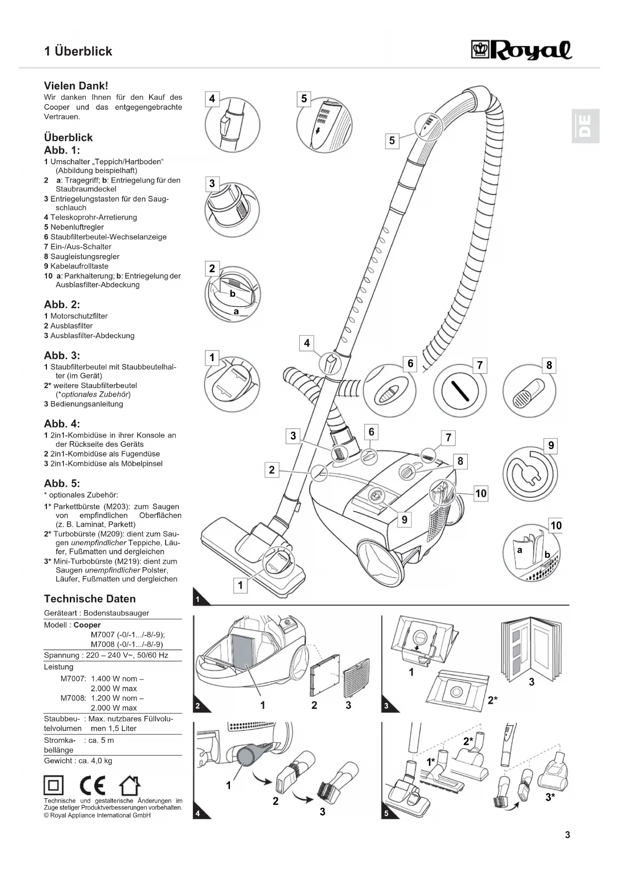 © Royal Appliance International GmbH Geräteart : BodenstaubsaugerModell : Cooper M7007 (-0/-1.../-8/-9);M7008 (-0/-1.../-8/-9)Spannung : 220 – 240 V~, 50/60 HzLeistungM7007M7008 :