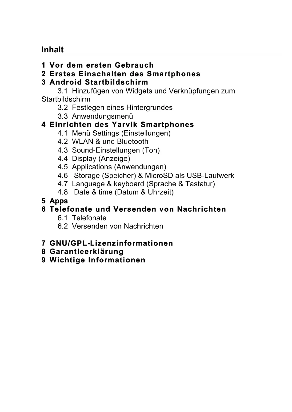 7 GNU/GPL-Lizenzinformationen 8 Garantieerklärung 9 Wichtige Informationen1 Vor dem ersten Gebrauch Sehr geehrte Benutzerin, sehr geehrter Benutzer, vielen Dank, dass Sie sich zum Kauf unseres Produkts entschieden haben! Lesen Sie diese Anleitung sorgfältig durch, um Ihr neues Yarvik Smartphone schnell und mühelos verwenden zu können. Wir hoffen, dass Sie an Ihrem Yarvik Smartphone sehr lange Freude haben! Bitte beachten: Das Yarvik Smartphone ist ein hochpräzises elektronisches Produkt. Versuchen Sie nicht, das Smartphone zu zerlegen, da dies zum Erlöschen der Garantie und zu Fehlfunktionen des Geräts führt. - Vermeiden Sie eine starke Stoßeinwirkung auf das Produkt. - Verwenden Sie das Smartphone nicht in Umgebungen mit hohen oder niedrigen Temperaturen, und vermeiden Sie den Kontakt mit Feuchtigkeit, Staub oder Magnetfeldern. - Setzen Sie das Smartphone nicht für einen längeren Zeitraum starker Sonneneinstrahlung aus. - Bedienen Sie den Touchscreen des Smartphones nicht mit spitzen Gegenständen, da hierdurch die Bildschirmoberfläche zerkratzen kann. - Längeres Verwenden von Kopfhörern mit dem Smartphone bzw. eine zu hohe Lautstärke der Kopfhörer kann zu dauerhaften Hörschädigungen führen. - Um Verkehrsunfälle zu vermeiden, überqueren Sie nicht die Straße, führen Sie keine Motorfahrzeuge oder fahren Sie nicht Fahrrad, während Sie das Smartphone mit Kopfhörern verwenden. - Verwenden Sie mit dem Yarvik Smartphone nur die zulässigen Akkus, Ladegeräte und Zubehör. Die Verwendung anderer Produkte mit dem Smartphone kann Gefährdungen verursachen und die Garantiebestimmungen verletzen. - Reinigen Sie das Smartphone ausschließlich mit einem Baumwolltuch, das mit Wasser leicht angefeuchtet wurde. Das Smartphone darf nicht mit einem (Glas- )Reinigungsmittel gereinigt werden. Das Yarvik Smartphone ist sofort nach dem Auspacken einsatzbereit und muss nicht zuerst aufgeladen werden. Der Akku sollte zunächst mit seiner ursprünglichen Ladung verwendet und vollständig entladen werden, bevor er zum ersten Mal aufgeladen wird. Wenn sich das Smartphone nach dem Auspacken nicht einschalten lässt, ist der Akku bereits vollständig entladen und muss in diesem Fall zunächst aufgeladen werden.2 Erstes Einschalten des Smartphones Nach dem ersten Einschalten des Yarvik Smartphones durchläuft dieses eine Startsequenz. Der erste Start kann mit ca. 2-3 Minuten einige Zeit in Anspruch nehmen. Nach der Startsequenz ist das Smartphone einsatzbereit, und es wird der Android Sperrbildschirm angezeigt.