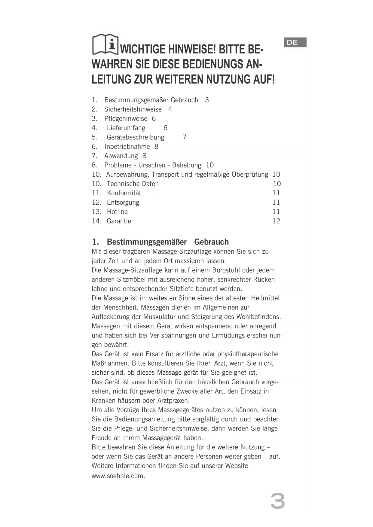 Mit dieser tragbaren Massage-Sitzauflage können Sie sich zu jeder Zeit und an jedem Ort massieren lassen.Die Massage-Sitzauflage kann auf einem Bürostuhl oder jedem anderen Sitzmöbel mit ausreichend hoher, senkrechter Rücken-lehne und entsprechender Sitztiefe benutzt werden.Die Massage ist im weitesten Sinne eines der ältesten Heilmittel der Menschheit. Massagen dienen im Allgemeinen zur Auflockerung der Muskulatur und Steigerung des Wohlbefindens. Massagen mit diesem Gerät wirken entspannend oder anregend und haben sich bei Ver spannungen und Ermüdungs erschei nun-gen bewährt. Das Gerät ist kein Ersatz für ärztliche oder physiotherapeutische Maßnahmen. Bitte konsultieren Sie Ihren Arzt, wenn Sie nicht sicher sind, ob dieses Massage gerät für Sie geeignet ist. Das Gerät ist ausschließlich für den häuslichen Gebrauch vorge-sehen, nicht für gewerbliche Zwecke aller Art, den Einsatz in Kranken häusern oder Arztpraxen.Um alle Vorzüge Ihres Massagegerätes nutzen zu können, lesen Sie die Bedienungsanleitung bitte sorgfältig durch und beachten Sie die Pflege- und Sicherheitshinweise, dann werden Sie lange Freude an Ihrem Massagegerät haben.Bitte bewahren Sie diese Anleitung für die weitere Nutzung –oder wenn Sie das Gerät an andere Personen weiter geben – auf.Weitere Informationen finden Sie auf unserer Website www.soehnle.com.