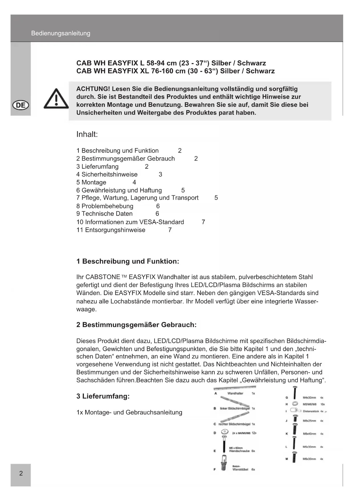 CAB WH EASYFIX L 58-94 Cm (23 - 37“) SILBEr / Silver 51932 CAB WH EASYFIX L 58-94 Cm (23 - 37“) SCHWArz / Black 51933 CAB WH EASYFIX XL 76-160 Cm (30 - 63“) SILBEr / Silver 51938 CAB WH EASYFIX XL 76-160 Cm (30 - 63“) SCHWArz / Black 51939 Bedienungsanleitung Manual Notice d’utilisation Manual Istruzioni per l’uso Bruksanvisning Manual Οδηγίες Χρήσης2 Inhalt: 1 Beschreibung und Funktion 2 2 Bestimmungsgemäßer Gebrauch 2 3 Lieferumfang 2 4 Sicherheitshinweise 3 5 Montage 4 6 Gewährleistung und Haftung 5 7 Pege, Wartung, Lagerung und Transport 5 8 Problembehebung 6 9 Technische Daten 6 10 Informationen zum VESA-Standard 7 11 Entsorgungshinweise 7 Bedienungsanleitung CAB WH EASYFIX L 58-94 cm (23 - 37“) Silber / Schwarz CAB WH EASYFIX XL 76-160 cm (30 - 63“) Silber / Schwarz ACHTUNG! Lesen Sie die Bedienungsanleitung vollständig und sorgfältig durch. Sie ist Bestandteil des Produktes und enthält wichtige Hinweise zur korrekten Montage und Benutzung. Bewahren Sie sie auf, damit Sie diese bei Unsicherheiten und Weitergabe des Produktes parat haben. 1 Beschreibung und Funktion: Ihr CABSTONE