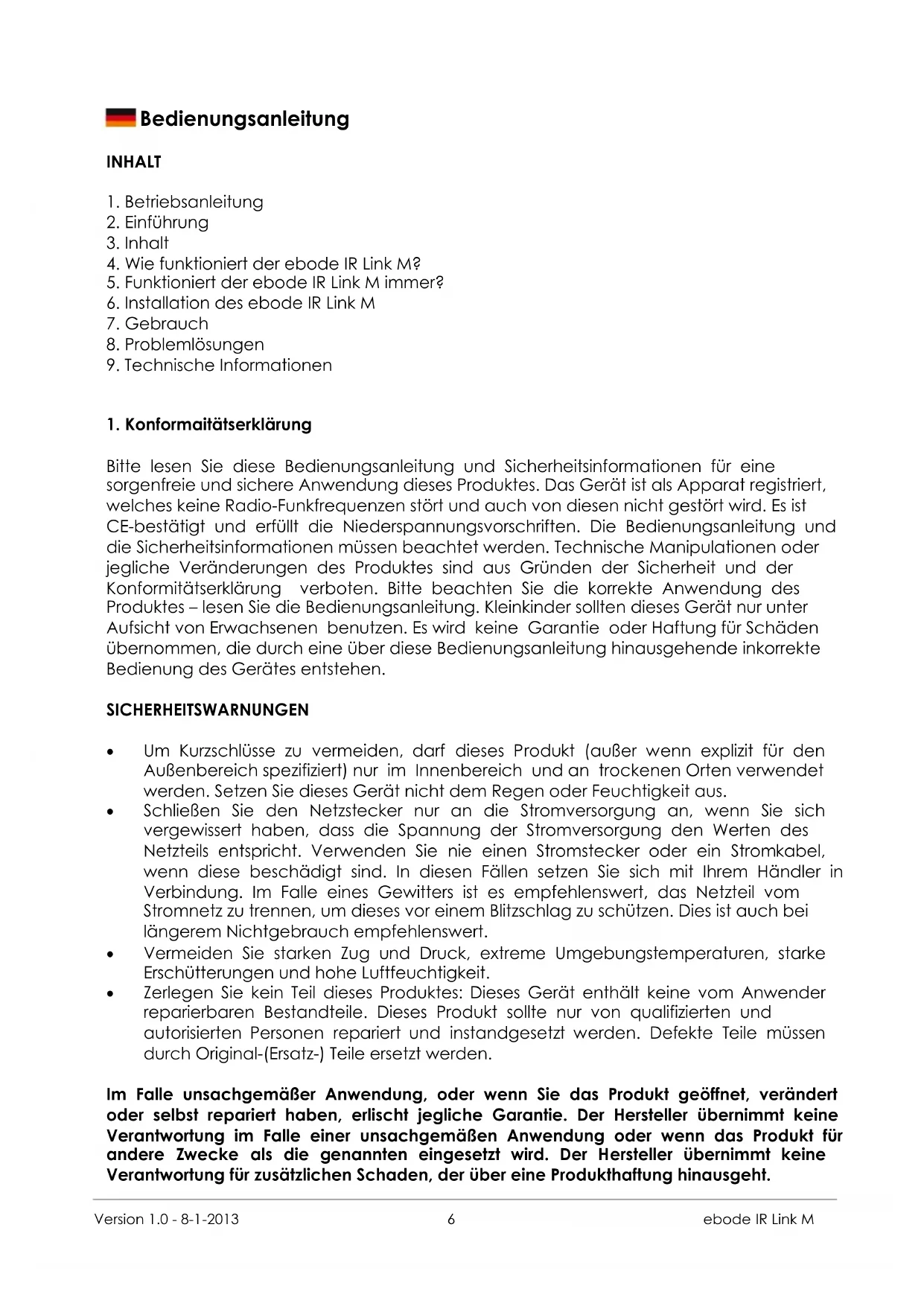 Bitte lesen Sie diese Bedienungsanleitung und Sicherheitsinformationen für eine sorgenfreie und sichere Anwendung dieses Produktes. Das Gerät ist als Apparat registriert, welches keine Radio-Funkfrequenzen stört und auch von diesen nicht gestört wird. Es ist CE-bestätigt und erfüllt die Niederspannungsvorschriften. Die Bedienungsanleitung und die Sicherheitsinformationen müssen beachtet werden. Technische Manipulationen oder jegliche Veränderungen des Produktes sind aus Gründen der Sicherheit und der Konformitätserklärung verboten. Bitte beachten Sie die korrekte Anwendung des Produktes – lesen Sie die Bedienungsanleitung. Kleinkinder sollten dieses Gerät nur unter Aufsicht von Erwachsenen benutzen. Es wird keine Garantie oder Haftung für Schäden übernommen, die durch eine über diese Bedienungsanleitung hinausgehende inkorrekte Bedienung des Gerätes entstehen. SICHERHEITSWARNUNGEN Um Kurzschlüsse zu vermeiden, darf dieses Produkt (außer wenn explizit für den Außenbereich spezifiziert) nur im Innenbereich und an trockenen Orten verwendet werden. Setzen Sie dieses Gerät nicht dem Regen oder Feuchtigkeit aus. Schließen Sie den Netzstecker nur an die Stromversorgung an, wenn Sie sich vergewissert haben, dass die Spannung der Stromversorgung den Werten des Netzteils entspricht. Verwenden Sie nie einen Stromstecker oder ein Stromkabel, wenn diese beschädigt sind. In diesen Fällen setzen Sie sich mit Ihrem Händler in Verbindung. Im Falle eines Gewitters ist es empfehlenswert, das Netzteil vom Stromnetz zu trennen, um dieses vor einem Blitzschlag zu schützen. Dies ist auch bei längerem Nichtgebrauch empfehlenswert. Vermeiden Sie starken Zug und Druck, extreme Umgebungstemperaturen, starke Erschütterungen und hohe Luftfeuchtigkeit. Zerlegen Sie kein Teil dieses Produktes: Dieses Gerät enthält keine vom Anwender reparierbaren Bestandteile. Dieses Produkt sollte nur von qualifizierten und autorisierten Personen repariert und instandgesetzt werden. Defekte Teile müssen durch Original-(Ersatz-) Teile ersetzt werden. Im Falle unsachgemäßer Anwendung, oder wenn Sie das Produkt geöffnet, verändert oder selbst repariert haben, erlischt jegliche Garantie. Der Hersteller übernimmt keine Verantwortung im Falle einer unsachgemäßen Anwendung oder wenn das Produkt für andere Zwecke als die genannten eingesetzt wird. Der Hersteller übernimmt keine Verantwortung für zusätzlichen Schaden, der über eine Produkthaftung hinausgeht.Version 1.0 - 8-1-2013 7 ebode IR Link M