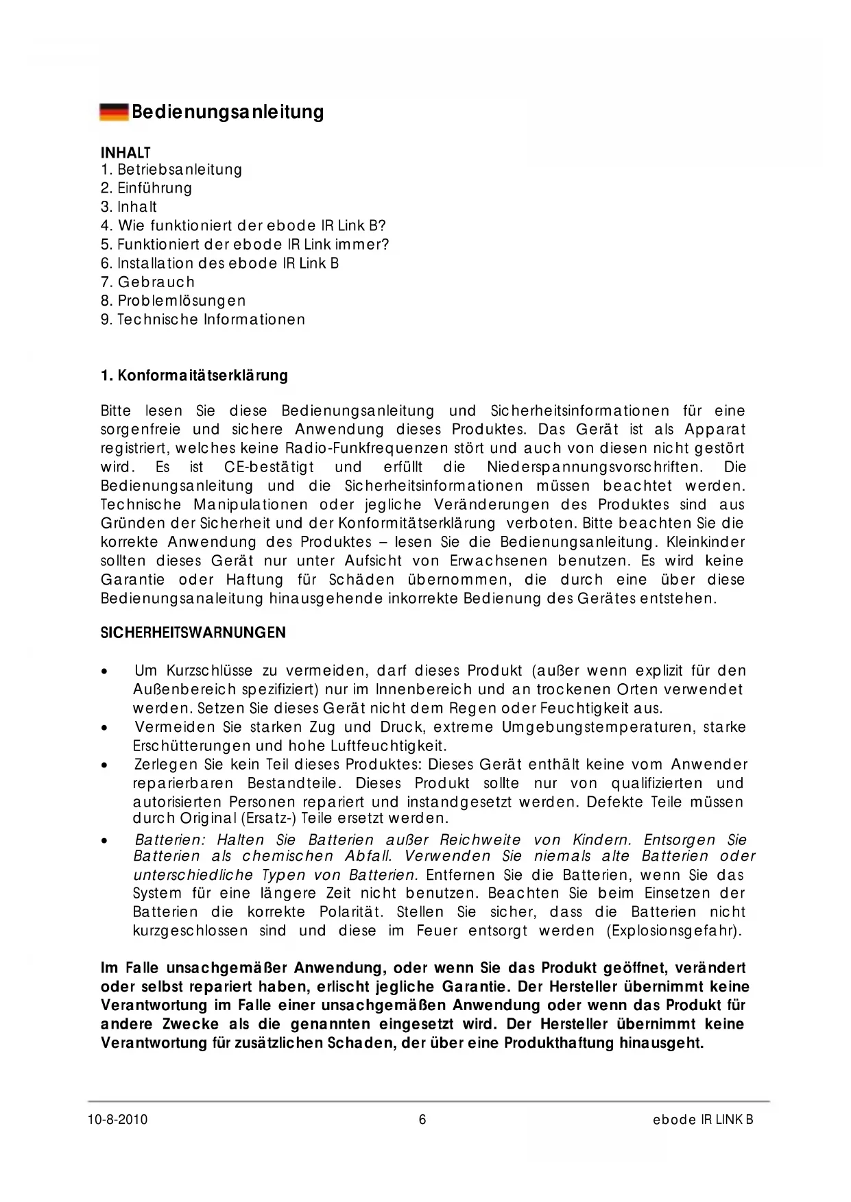 - Batterien: Halten Sie Batterien außer Reichweite von Kindern. Entsorgen Sie Batterien als chemischen Abfall. Verwenden Sie niemals alte Batterien oder unterschiedliche Typen von Batterien. Entfernen Sie die Batterien, wenn Sie das System für eine längere Zeit nicht benutzen. Beachten Sie beim Einsetzen der Batterien die korrekte Polarität. Stellen Sie sicher, dass die Batterien nicht kurzgeschlossen sind und diese im Feuer entsorgt werden (Explosionsgefahr). Im Falle unsachgemäßer Anwendung, oder wenn Sie das Produkt geöffnet, verändert oder selbst repariert haben, erlischt jegliche Garantie. Der Hersteller übernimmt keine Verantwortung im Falle einer unsachgemäßen Anwendung oder wenn das Produkt für andere Zwecke als die genannten eingesetzt wird. Der Hersteller übernimmt keine Verantwortung für zusätzlichen Schaden, der über eine Produkthaftung hinausgeht.10-8-2010 7 ebode IR LINK B