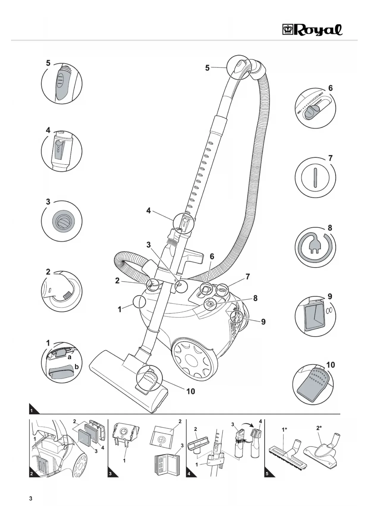 Abb. 1: 1 a: Entriegelung für den Staubraum-deckel;b: Griffmulde zum Tragen2 Entriegelungstasten für den Saug-schlauch3 Staubfilterbeutel-Wechselanzeige4 Teleskoprohr-Arretierung5 Nebenluftregler6 Saugleistungsregler7 Ein-/Aus-Schalter8 Kabelaufrolltaste9 Entriegelung der Ausblasfilter-Abde-ckung10 Umschalter „Teppich/Hartboden“ Abb. 2: 1 Motorschutzfilter2 Ausblasfiltereinheit bestehend aus:3 Schaumstofffilterelement4 Filterhalter mit eingenähtem Vlies Abb. 3: 1 Papier-Staubfilterbeutel mit Halte-rung (im Gerät)2 ein weiterer Papier-Staubfilterbeutel(im Karton)3 Bedienungsanleitung Abb. 4: 1 Zubehörhalterung2 Polsterdüse3 2in1-Kombidüse als Fugendüse4 2in1-Kombidüse als Möbelpinsel Abb. 5: * optionales Zubehör:1 *Parkettbürste (M203):zum Saugen von empfindlichenOberflächen (z. B. Laminat, Parkett)2 *Turbobürste (M209):zur Tiefenreinigung von Teppichen per rotierendem Bürstkopf Technische Daten Technische und gestalterische Änderungen imZuge stetiger Produktverbesserungen vorbehalten.© Royal Appliance International GmbHGeräteart : BodenstaubsaugerModell : POPSTER M7012 (-0/.../-9)Spannung : 220 – 240 V~, 50/60 HzLeistung : 1.400 W nom – 2.000 W maxStaubbeutel-volumen : Max. nutzbares Füllvolu-men 1,5 LiterStromkabel-länge: ca. 5 mGewicht : ca. 4,5 kg POPSTER.book Seite 4 Freitag, 6. Mai 2011 1:32 135