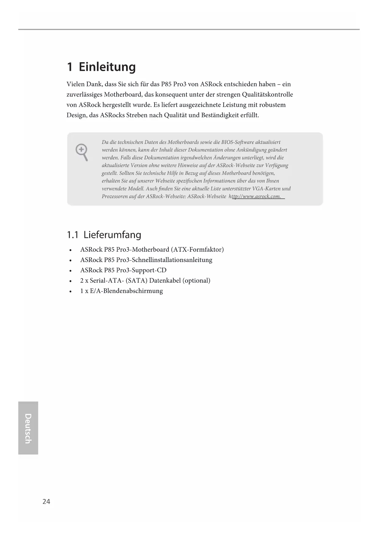 • 1 x E/A-Blendenabschirmung Da die technischen Daten des Motherboards sowie die BIOS-Soware aktualisiert werden können, kann der Inhalt dieser Dokumentation ohne Ankündigung geändert werden. Falls diese Dokumentation irgendwelchen Änderungen unterliegt, wird die aktualisierte Version ohne weitere Hinweise auf der ASRock-Webseite zur Verfügung gestellt. Sollten Sie technische Hilfe in Bezug auf dieses Motherboard benötigen, erhalten Sie auf unserer Webseite spezischen Informationen über das von Ihnen verwendete Modell. Auch nden Sie eine aktuelle Liste unterstützter VGA-Karten und Prozessoren auf der ASRock-Webseite: ASRock-Webseite http://www.asrock.com.P85 Pro3