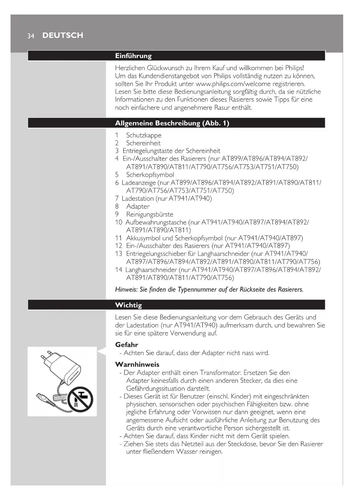 - Ziehen Sie stets das Netzteil aus der Steckdose, bevor Sie den Rasierer