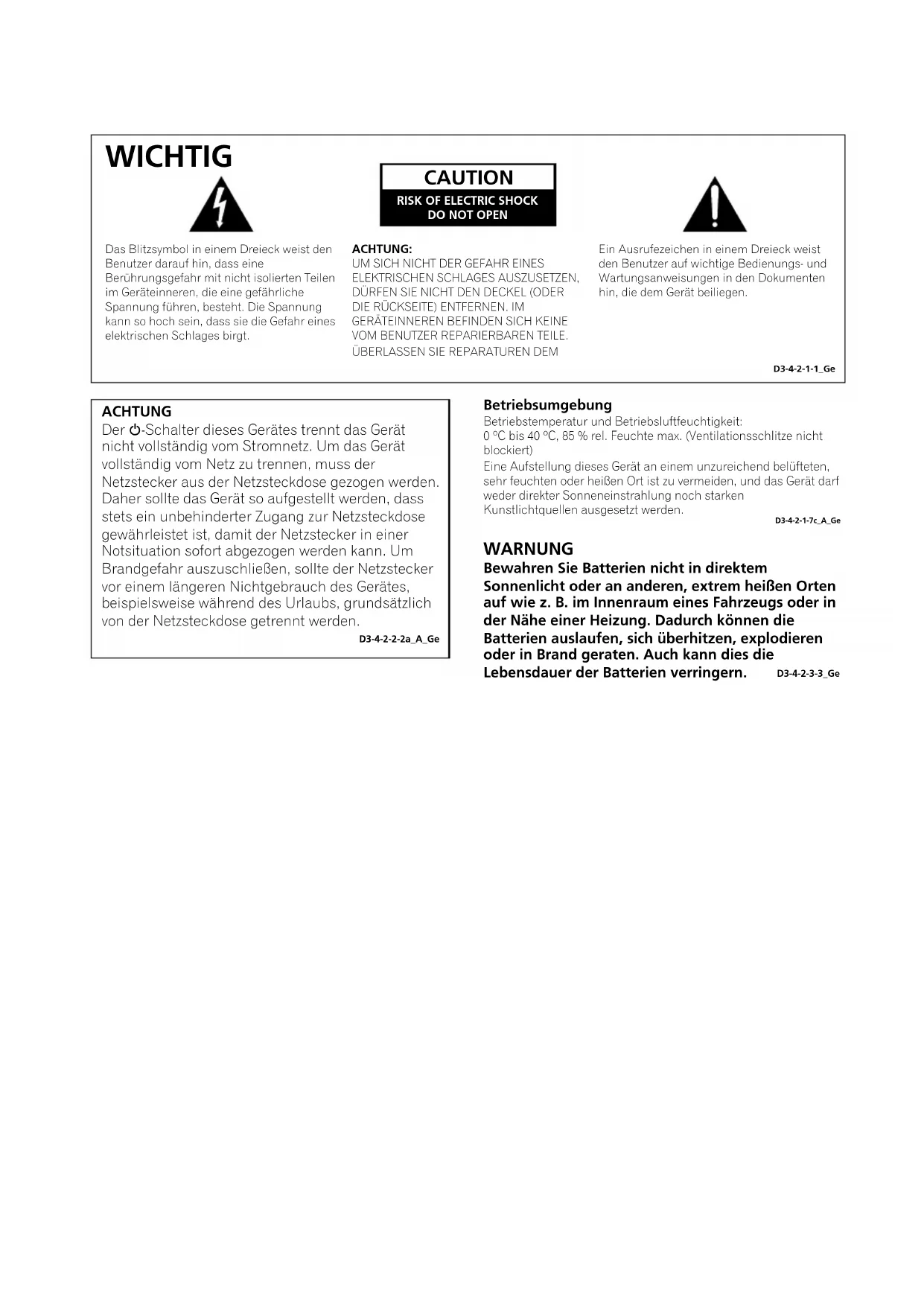 WARNUNG Dieses Gerät ist nicht wasserdicht. Zur Vermeidung der Gefahr von Brand und Stromschlag keine Behälter mit Flüssigkeiten (z.B. Blumenvasen und -töpfe) in die Nähe des Gerätes bringen und dieses vor Tropfwasser, Spritzwasser, Regen und Nässe schützen.D3-4-2-1-3_A_GeDie nachstehenden Symbole befinden sich auf am Gerät angebrachten Aufklebern. Sie machen den Benutzer und das Wartungspersonal auf mögliche Gefahren aufmerksam. Dieses Produkt erfüllt die Niederspannungsrichtilie