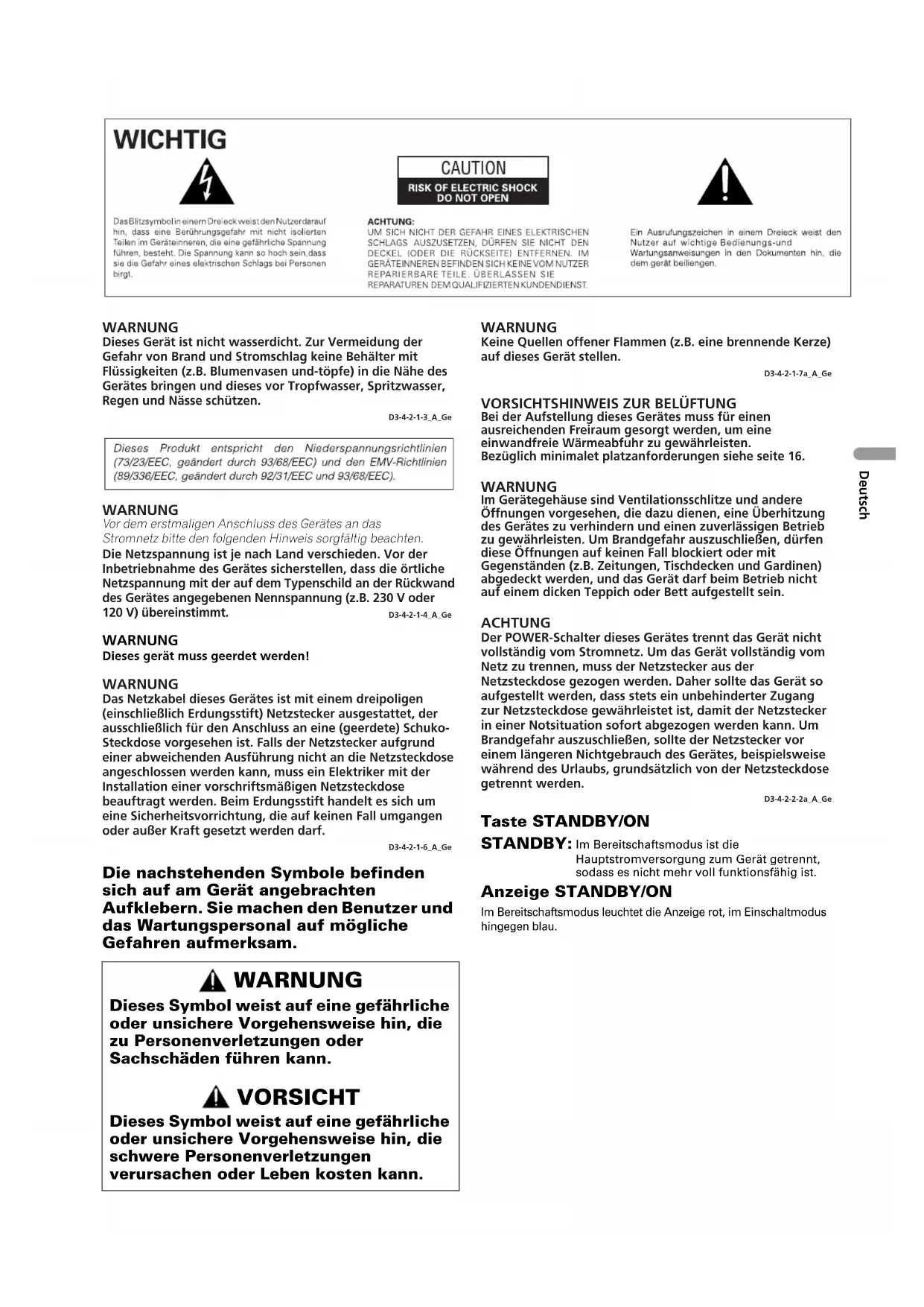 WARNUNG Dieses Gerät ist nicht wasserdicht. Zur Vermeidung der Gefahr von Brand und Stromschlag keine Behälter mit Flüssigkeiten (z.B. Blumenvasen und-töpfe) in die Nähe des Gerätes bringen und dieses vor Tropfwasser, Spritzwasser, Regen und Nässe schützen.D3-4-2-1-3_A_Ge WARNUNG Die Netzspannung ist je nach Land verschieden. Vor der Inbetriebnahme des Gerätes sicherstellen, dass die örtliche Netzspannung mit der auf dem Typenschild an der Rückwand des Gerätes angegebenen Nennspannung (z.B. 230 V oder 120 V) übereinstimmt.D3-4-2-1-4_A_Ge Vor dem erstmaligen Anschluss des Gerätes an das