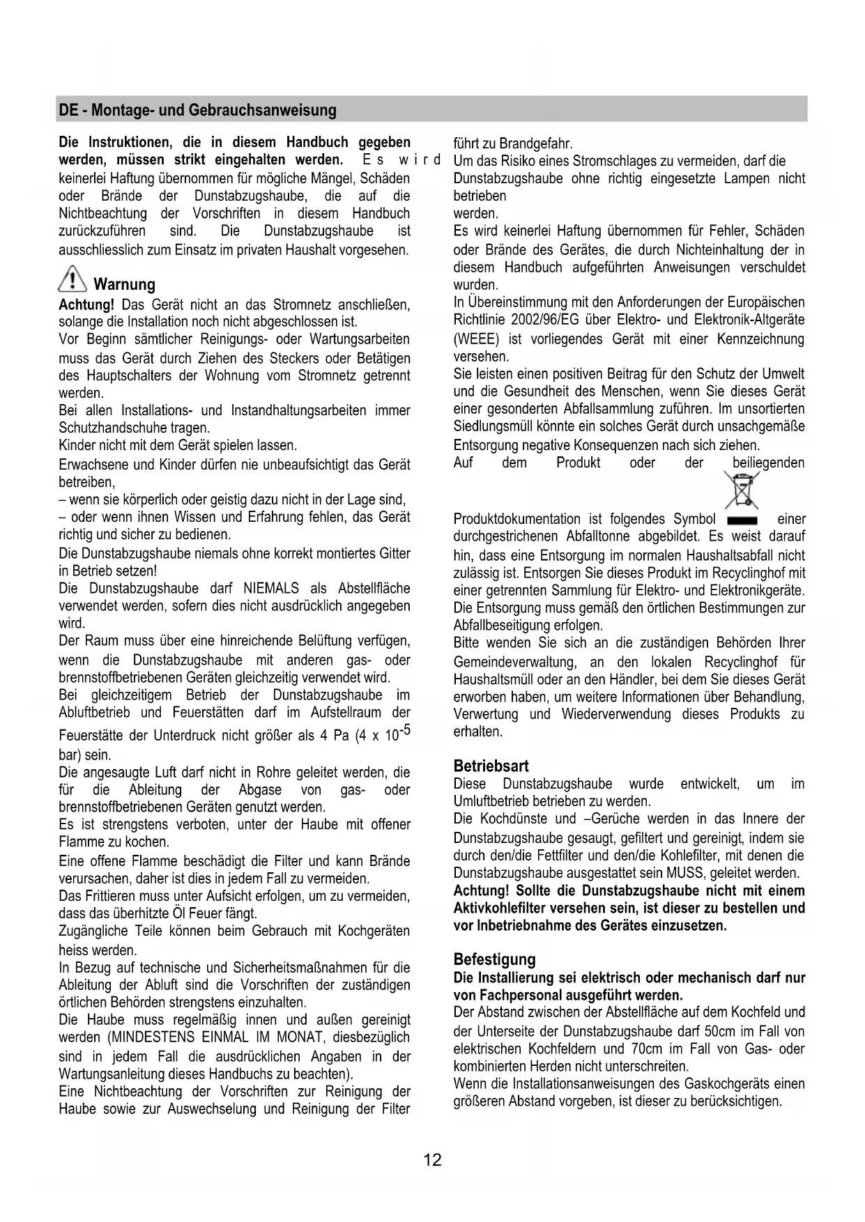 Achtung! Sollte die Dunstabzugshaube nicht mit einem