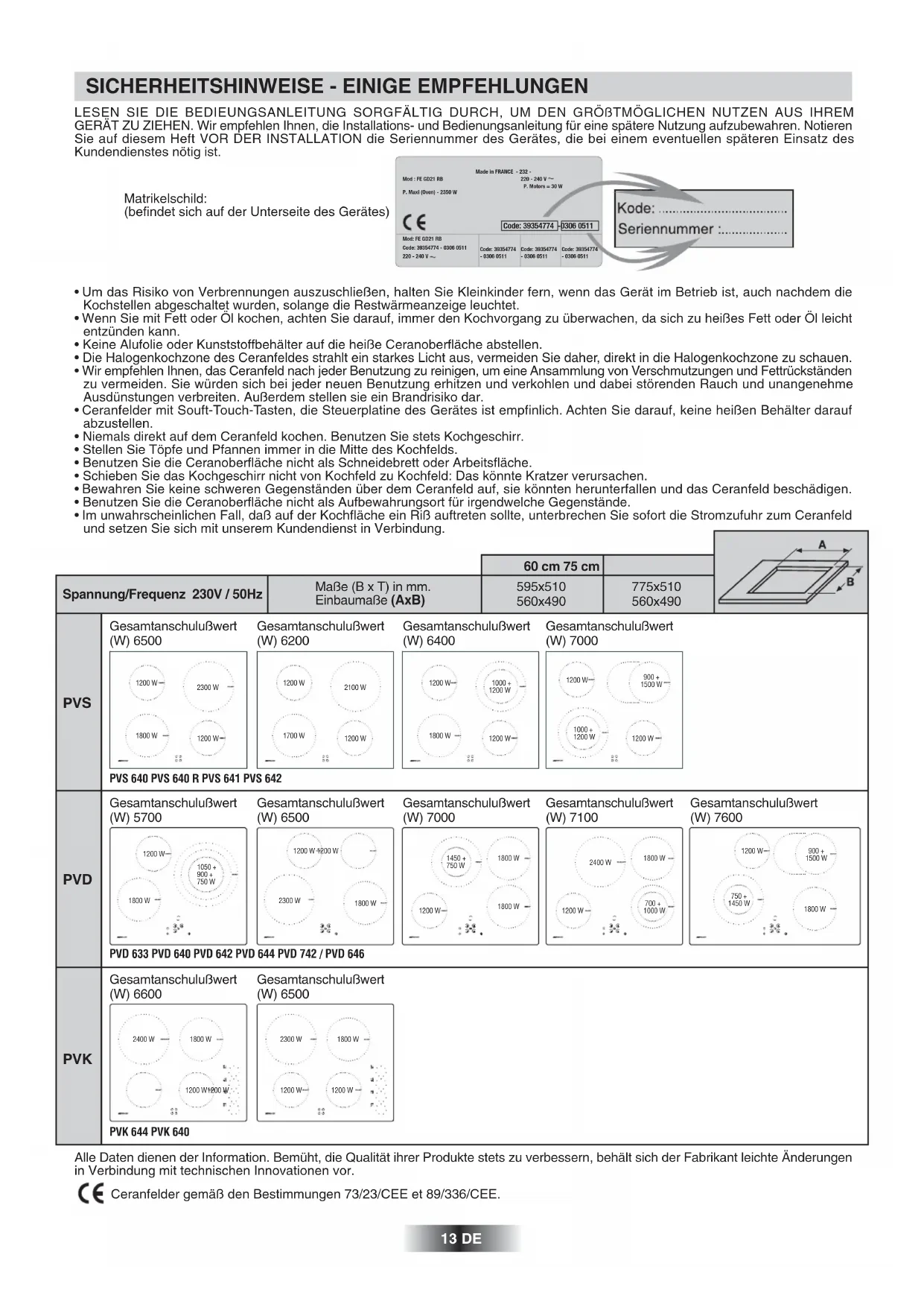 Ceranfelder gemäß den Bestimmungen 73/23/CEE et 89/336/CEE. Made in FRANCE - 232 -220 - 240 V P. Motors = 30 WMod : FE GD21 RBP. Maxi (Oven) - 2350 W Code: 39354774 -0306 0511 Mod: FE GD21 RBCode: 39354774 - 0306 0511220 - 240 VCode: 39354774- 0306 0511Code: 39354774- 0306 0511Code: 39354774- 0306 0511 Matrikelschild: