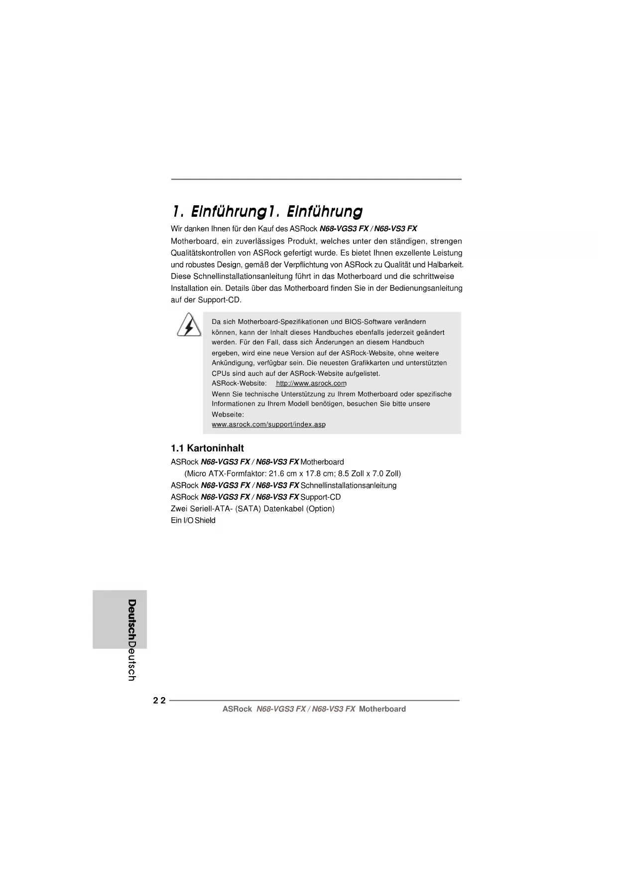 Wir danken Ihnen für den Kauf des ASRock N68-VGS3 FX / N68-VS3 FX Motherboard, ein zuverlässiges Produkt, welches unter den ständigen, strengen