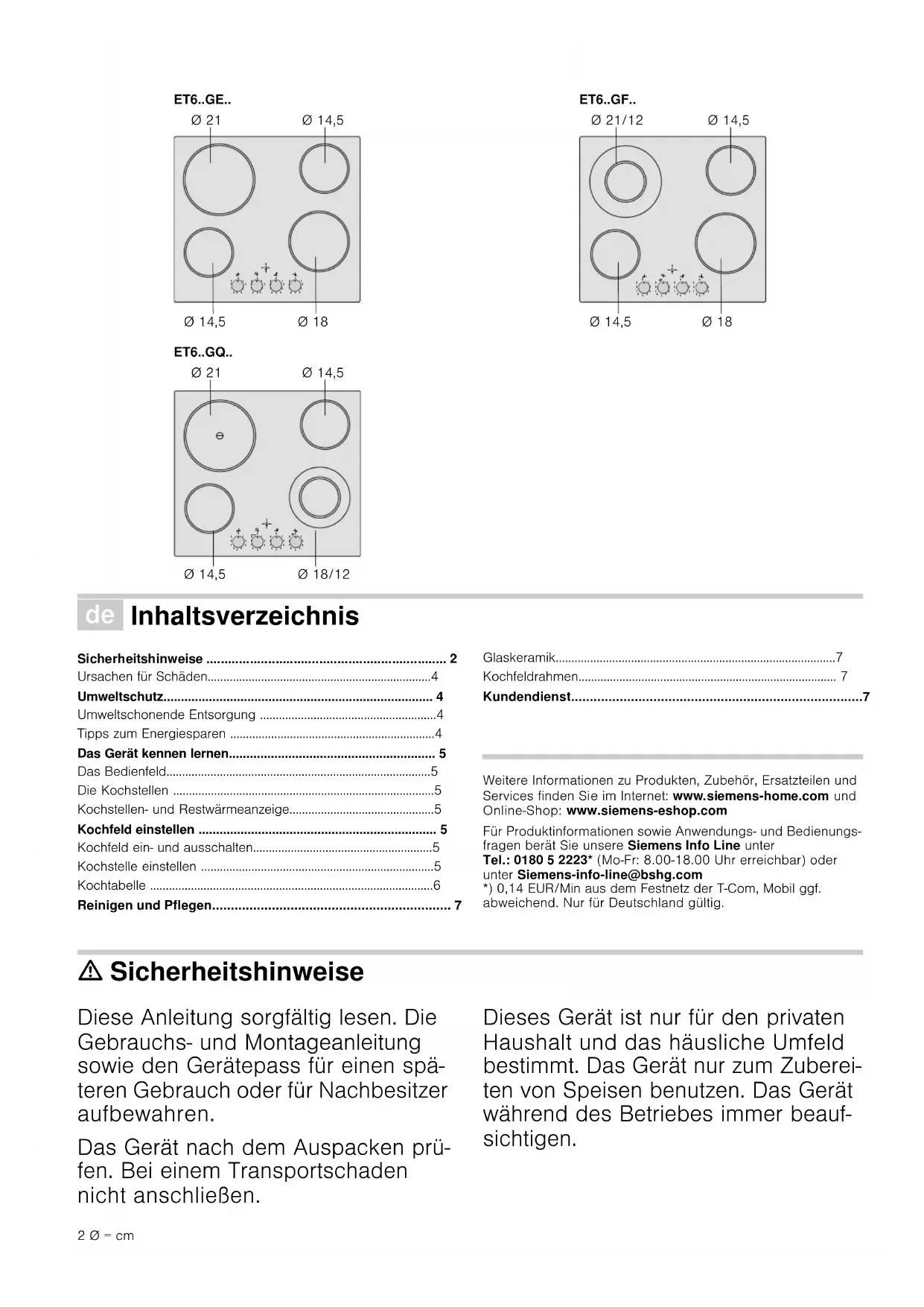Sicherheitshinweise 2 Ursachen für Schäden4Umweltschutz 4Umweltschonende Entsorgung 4Tipps zum Energiesparen 4Das Gerät kennen lernen 5Das Bedienfeld5Die Kochstellen 5Kochstellen- und Restwärmeanzeige5Kochfeld einstellen 5Kochfeld ein- und ausschalten5Kochstelle einstellen 5Kochtabelle 6Reinigen und Pflegen 7Glaskeramik7Kochfeldrahmen 7Kundendienst7 Produktinfo Weitere Informationen zu Produkten, Zubehör, Ersatzteilen und Services finden Sie im Internet: www.siemens-home.com und Online-Shop: www.siemens-eshop.comFür Produktinformationen sowie Anwendungs- und Bedienungs-fragen berät Sie unsere Siemens Info Line unter Tel.: 0180 5 2223* (Mo-Fr: 8.00-18.00 Uhr erreichbar) oder unter Siemens-info-line@bshg.com *) 0,14 EUR/Min aus dem Festnetz der T-Com, Mobil ggf. abweichend. Nur für Deutschland gültig. ã=Sicherheitshinweise
