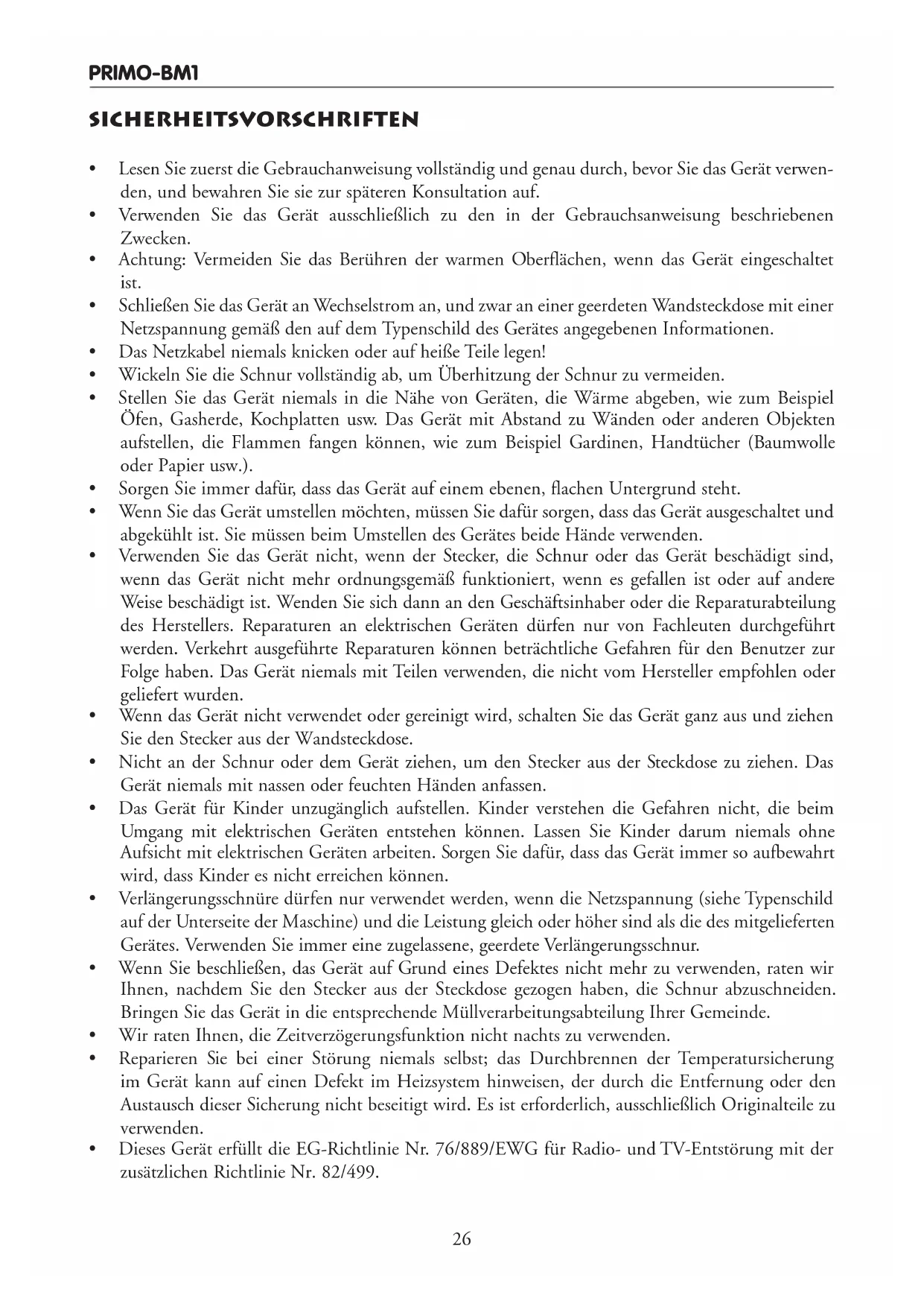 - Dieses Gerät erfüllt die EG-Richtlinie Nr. 76/889/EWG für Radio- und TV-Entstörung mit der zusätzlichen Richtlinie Nr. 82/499. 26PRIMO-BM1