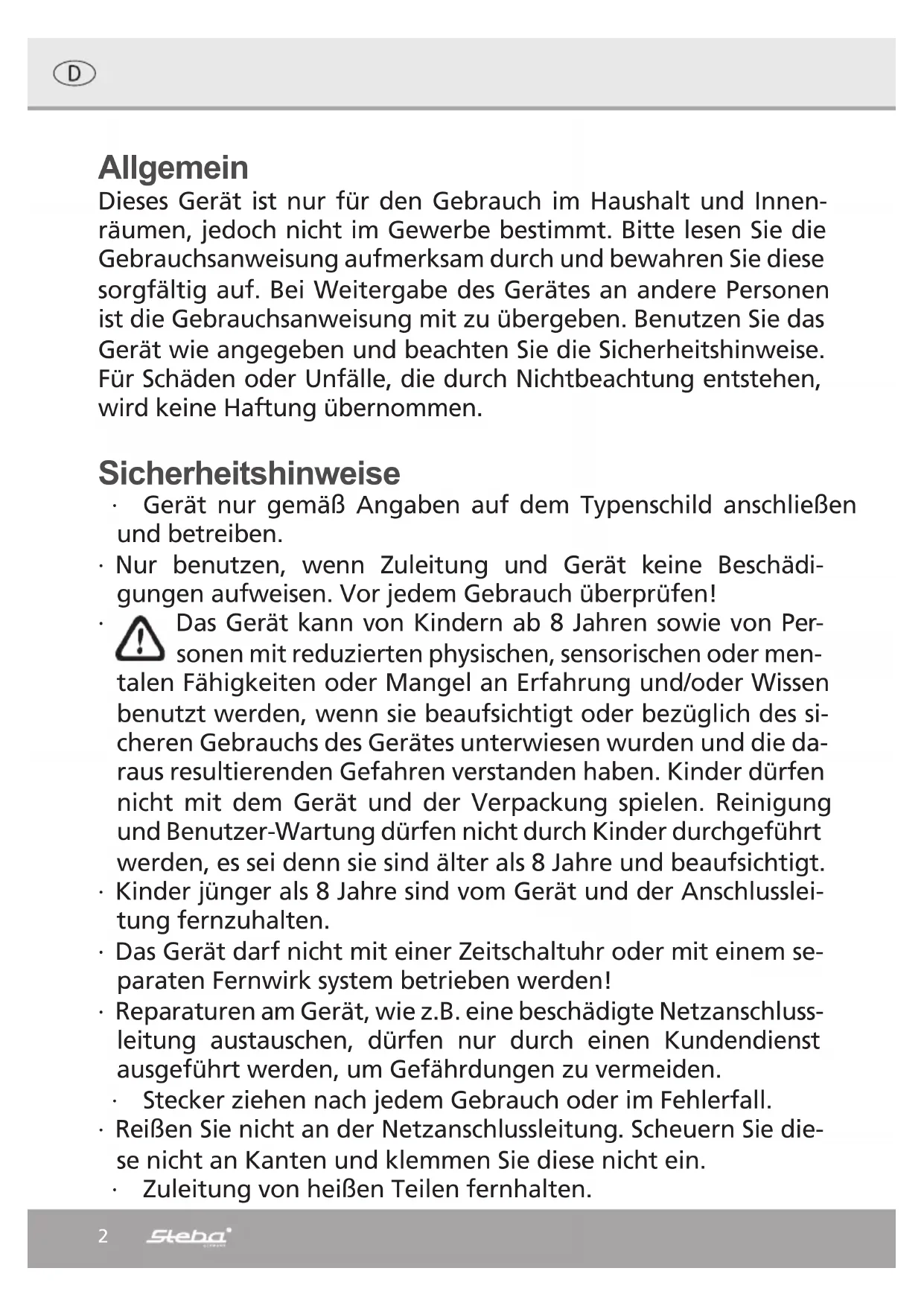 ∙ Das rote Licht leuchtet und zeigt an, dass das Gerät angeschlossen ist. Lassen Sie den Deckel geschlossen, stellen den Thermostat auf die gewünschte Temperatur. ∙ Wenn die gewünschte Temperatur erreicht ist, leuchtet die grüne Leuchte. ∙ Geben Sie die Speisen in das Gerät und schließen Sie den Deckel. ∙ Während der Grillzeit kann das grüne Licht aus- und wieder anschalten. Der Thermostat arbeitet. ∙ Wenn die Speisen fertig sind, diese mit einem Holz oder Plastikspatel herausnehmen, damit die Beschichtung nicht beschädigt wird. ∙ Um keine Hitze zu verlieren, den Deckel immer schließen, ausgenommen bei der Stel- lung Partygrill. ∙ Wenn das grüne Licht leuchtet, können Sie das Gerät erneut mit Toast- und Grillgut bestücken. Die jeweilige Grillzeit und die Temperatureinstellung ist abhängig von: ∙ Art und Stärke des Grillgutes ∙ dem gewünschten Bräunungsgrad ∙ und dem eigenen Geschmack Achtung: Es kann Dampf vom Toast- und Grillgut zwischen den Platten austreten. Verbrennungsgefahr!6 Temperatureinstellung product graphics FG 70 | 09.02.2012 © GESTALTUNGSWESEN any unauthorised use is prohibited product graphics FG 70 | switch printdata attached as *.ai and *.pdf color: white as in product sample 150°C 180°C 200°C 220°C 140°C Schongarstufe für Geflügel, nachdem dieses mit 180° angebraten wurde150°C Gemüse Schongarstufe für Fleisch, nachdem dieses mit 220° angebraten wurde180°C Anbratstufe für Geflügel/Meeresfrüchte/Wild220°C Anbratstufe für helles und dunkles Fleisch Tips für die Praxis: KontaktgrillenEs eignen sich Fleischstücke, die Sie auch zum Kurzbraten in der Pfanne verwenden wür-den. Fleisch muß vor dem Grillen vollständig aufgetaut und gut trocken sein.Gesalzen wird nach dem Grillen. Paniertes Gargut besser bei einer niedrigeren Einstel-lung, dafür etwas länger garen. Wenn stark fetthaltige Lebensmittel gegrillt werden, muss das überschüssige Fett mit einem Küchenpapier abgewischt werden, damit dieses nicht in das Geräte-Innere läuft. Achtung! Platten sind heiß! ÜberbackenZum Beispiel belegte Toastscheiben. Toastbrot muß nicht vorgetoastet werden.PartygrillenZum ,,geselligen Braten” am Tisch benutzt man das Gerät wie eine große Bratpfanne zum Grillen aller Kurzbratstücke. Das Gut muß gewendet werden.7 Korrekte Entsorgung dieses Produkts: Ausgediente Geräte sofort unbrauchbar machen. Innerhalb der EU weist dieses Symbol darauf hin, dass dieses Produkt nicht über den Hausmüll entsorgt werden darf. Altgeräte enthalten wertvolle recyclingfähige Materialien, die einer Wiederverwertung zugeführt werden sollten und um der Umwelt bzw. der menschlichen Gesundheit nicht durch unkon- trollierte Müllbeseitigung zu schaden. Bitte entsorgen Sie Altgeräte deshalb über geeignete Sammelstysteme oder senden Sie das Gerät zur Entsorgung an die Stelle, bei der Sie es gekauft haben. Diese wird dann das Gerät der stofflichen Verwertung zuführen. Verpackungs-Entsorgung Verpackungsmaterial nicht einfach wegwerfen, sondern der Wiederverwertung zuführen. Geräteverpackung: ∙ Papier-, Pappe- und Wellpappeverpackungen bei Altpapiersammelstellen abgeben ∙ ·Kunststoffverpackungsteile und Folien sollten ebenfalls in die dafür vorgesehenen ∙ Sammelbehälter gegeben werden In den Beispielen für die Kunststoffkennzeichnung steht: PE für Polyethylen, die Kennziffer 02 für PE-HD, 04 für PE-LD, PP für Polypropylen, PS für Polystürol. Kundenservice: Sollte Ihr Gerät wider Erwarten einmal den Kundendienst benötigen, wenden Sie sich bitte an nachfolgende Anschrift. Wir werden dann im Garantiefall die Abholung veranlassen. Das Gerät muss transportfähig verpackt sein. Unfreie Pakete können nicht angenommen werden! STEBA Elektrogeräte GmbH & Co KG Pointstr. 2, 96129 Strullendorf / Germany Vertrieb-Tel.:09543/449-17/-18,Service-Tel.:09543/449-44,Fax:09543/449-19 e-Mail: elektro@steba.com Internet: http://www.steba.com Achtung! Elektrogeräte dürfen nur durch Elektro-Fachkräfte repariert werden, da durch unsachgemäße Reparaturen erhebliche Folgeschäden entstehen können.8