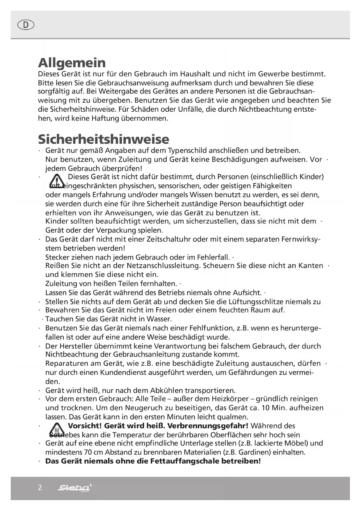 www.steba.com Kontakt-Grill FG55 Gebrauchsanweisung 2 Rezeptvorschläge 7 Instructions for use 10 Mode d´emploi 14 Gebruiksaanwijzing 18 480-13232 - FG55 - 07-2011.indd 1 27.07.2011 08:57:032 Allgemein Dieses Gerät ist nur für den Gebrauch im Haushalt und nicht im Gewerbe bestimmt. Bitte lesen Sie die Gebrauchsanweisung aufmerksam durch und bewahren Sie diese sorgfältig auf. Bei Weitergabe des Gerätes an andere Personen ist die Gebrauchsan- weisung mit zu übergeben. Benutzen Sie das Gerät wie angegeben und beachten Sie die Sicherheitshinweise. Für Schäden oder Unfälle, die durch Nichtbeachtung entste- hen, wird keine Haftung übernommen. Sicherheitshinweise Gerät nur gemäß Angaben auf dem Typenschild anschließen und betreiben. ∙ Nur benutzen, wenn Zuleitung und Gerät keine Beschädigungen aufweisen. Vor ∙ jedem Gebrauch überprüfen! ∙ Dieses Gerät ist nicht dafür bestimmt, durch Personen (einschließlich Kinder) mit eingeschränkten physischen, sensorischen, oder geistigen Fähigkeiten oder mangels Erfahrung und/oder mangels Wissen benutzt zu werden, es sei denn, sie werden durch eine für ihre Sicherheit zuständige Person beaufsichtigt oder erhielten von ihr Anweisungen, wie das Gerät zu benutzen ist. Kinder sollten beaufsichtigt werden, um sicherzustellen, dass sie nicht mit dem ∙ Gerät oder der Verpackung spielen. Das Gerät darf nicht mit einer Zeitschaltuhr oder mit einem separaten Fernwirksy- ∙ stem betrieben werden! Stecker ziehen nach jedem Gebrauch oder im Fehlerfall. ∙ Reißen Sie nicht an der Netzanschlussleitung. Scheuern Sie diese nicht an Kanten ∙ und klemmen Sie diese nicht ein. Zuleitung von heißen Teilen fernhalten. ∙ Lassen Sie das Gerät während des Betriebs niemals ohne Aufsicht. ∙ Stellen Sie nichts auf dem Gerät ab und decken Sie die Lüftungsschlitze niemals zu ∙ Bewahren Sie das Gerät nicht im Freien oder einem feuchten Raum auf. ∙ Tauchen Sie das Gerät nicht in Wasser. ∙ Benutzen Sie das Gerät niemals nach einer Fehlfunktion, z.B. wenn es herunterge- ∙ fallen ist oder auf eine andere Weise beschädigt wurde. Der Hersteller übernimmt keine Verantwortung bei falschem Gebrauch, der durch ∙ Nichtbeachtung der Gebrauchsanleitung zustande kommt. Reparaturen am Gerät, wie z.B. eine beschädigte Zuleitung austauschen, dürfen ∙ nur durch einen Kundendienst ausgeführt werden, um Gefährdungen zu vermei- den. Gerät wird heiß, nur nach dem Abkühlen transportieren. ∙ Vor dem ersten Gebrauch: Alle Teile – außer dem Heizkörper – gründlich reinigen ∙ und trocknen. Um den Neugeruch zu beseitigen, das Gerät ca. 10 Min. aufheizen lassen. Das Gerät kann in den ersten Minuten leicht qualmen. ∙ Vorsicht! Gerät wird heiß. Verbrennungsgefahr! Während des Betriebes kann die Temperatur der berührbaren Oberflächen sehr hoch sein Gerät auf eine ebene nicht empfindliche Unterlage stellen (z.B. lackierte Möbel) und ∙ mindestens 70 cm Abstand zu brennbaren Materialien (z.B. Gardinen) einhalten. Das Gerät niemals ohne die Fettauffangschale betreiben! ∙ 480-13232 - FG55 - 07-2011.indd 2 27.07.2011 08:57:053 Einsetzten der Platten Am einfachsten lassen sich die Platten in der Stellung ∙ wechseln. Die Platte leicht schräg in die Arretiernasen hinten einschieben und einrasten. ∙ Immer darauf achten, dass die Fettauffangschale eingeschoben ist. ∙ Vor dem ersten Gebrauch Fetten Sie die Grillflächen vor dem ersten Gebrauch einmalig leicht ein. Dann das Gerät fünf Minuten bei geschlossenen Grillflächen ohne Grillgut und bei maximaler Reglerstellung aufheizen. Zubereitung von Speisen Schließen Sie das Gerät gemäß Typenschildangabe an. ∙ Das rote und grüne Licht leuchtet und zeigt an, dass das Gerät angeschlossen ist und aufheizt. Lassen Sie den Deckel geschlossen, stellen den Thermostat auf die gewünschte Temperatur. Wenn die gewünschte Temperatur erreicht ist erlischt das grüne Licht. ∙ Geben Sie die Speisen in das Gerät und schließen Sie den Deckel. ∙ Während der Grillzeit kann das grüne Licht aus- und wieder anschalten. Der Ther- ∙ mostat arbeitet. Wenn die Speisen fertig sind, diese mit einem Holz oder Plastikspatel herausneh- ∙ men, damit die Beschichtung nicht beschädigt wird. Um keine Hitze zu verlieren, den Deckel immer schließen. ∙ Wenn das grüne Licht aus ist können Sie das Gerät erneut mit Toast- und Grillgut ∙ bestücken. Die jeweilige Grillzeit und die Temperatureinstellung ist abhängig von: Art und Stärke des Grillgutes ∙ dem gewünschten Bräunungsgrad ∙ und dem eigenen Geschmack ∙ Achtung: Es kann Dampf vom Toast- und Grillgut zwischen den Platten austreten. Verbrennungsgefahr! Temperatureinstellung 80°C Warmhaltestufe 110°C Fisch/Gemüse 140°C Schongarstufe für Geflügel, nachdem dieses mit 180° angebraten wurde 150°C Gemüse Schongarstufe für Fleisch, nachdem dieses mit 200° angebraten wurde 180°C Anbratstufe für Geflügel/Meeresfrüchte/Wild 200°C Anbratstufe für helles und dunkles Fleisch 480-13232 - FG55 - 07-2011.indd 3 27.07.2011 08:57:054 Tips fürs Kontaktgrillen Es eignen sich Fleischstücke, die Sie auch zum Kurzbraten in der Pfanne verwenden würden. Fleisch muß vor dem Grillen vollständig aufgetaut und gut trocken sein. Gesalzen wird nach dem Grillen. Paniertes Gargut besser bei einer niedrigeren Einstel- lung, dafür etwas länger garen. Wenn stark fetthaltige Lebensmittel gegrillt werden, muss das überschüssige Fett mit einem Küchenpapier und einer Grillzange abge- wischt werden, damit dieses nicht in das Geräte-Innere läuft. Achtung! Platten sind Heiß! Reinigung ∙ Achtung! Vor jeder Reinigung Netzstecker ziehen. Gerät nicht in Wasser tauchen. Die Platten lassen sich besser reinigen, wenn sie noch etwas warm sind. Die Platten ∙ in lauwarmen Wasser kurzzeitig einweichen - so lassen sich die schwarzen Grillrück- stände leichter entfernen. Platten aus dem Gerät nehmen und nur mit Spülbürste und Spülmittel 