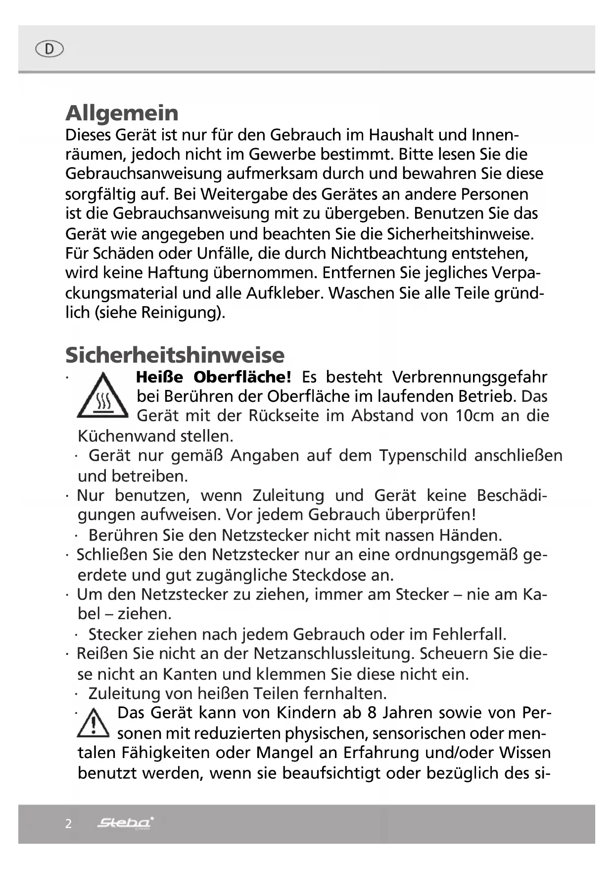 - Diese Angaben sind circa-Werte und richten sich nach Größen, Gewicht und Temperatur des Frittiergutes.11 Wichtiger Hinweis! Nach neuesten Erkenntnissen der Forschung und der Lebensmittelindustrie sollten folgende max. Frittiertemperaturen eingehalten und jegliche Lebensmittel maximal „goldgelb“ frittiert werden 170°C Für alle Kartoffelprodukte, panierte Lebensmittel und sonstige stärkehaltige Produkte 190°C für Fleisch- und Geflügelprodukte ohne Panade Entgegen einigen Verpackungshinweisen empfehlen wir ein Auftauen von tiegefrorenen Lebensmittel kurz vor dem frittieren. Nach dem Frittieren: Frittierfett reinigen Rückstände aus der Panade oder Frittiergut sollten regelmäßig aus dem Frittierfett bzw. Öl enfernt werden. Bei dieser Fritteuse lagern sich Verunreinigungen bzw. Was- ser in der „Cool Zone“ unter den Heizelementen ab und verbrennen nicht. ∙ Nach dem Frittieren zunächst das Fett abkühlen lassen, dann das Fett vorsichtig in einen Metalltopf mit Griffen umgießen. ∙ Panade-Rückstände und Wasser im Öl sind unbedingt zu entfernen. ∙ Frittierkorb und Frittiertopf reinigen (Siehe Absatz „Reinigung und Pflege“). ∙ Frittierkorb in die Fritteuse einhängen (Abtropfstellung und ein Küchenpapier als Filter in den Korb einlegen. ∙ Frittierfett langsam durch den Papierfilter in die Fritteuse zurückgießen. ∙ Papier-Fettfilter nur einmal verwenden. Sollte das Fett etwas Geschmack angenommen haben, kann man dies verbessern, indem man den Temperaturregler auf etwas unter 150°C stellt, eine Handvoll Spinatblätter, Petersilie, Salatblätter oder 2 geschälte, in Scheiben geschnittene, gut abgetrocknete Kartoffeln in das erhitzte Fett gibt und sie solange im Fett lässt bis sie sich bräunlich verfärben. Das Gemüse entnehmen und wegwerfen. Öl bzw Fett aufbewahren Beim häufigen Frittieren kann das Fett in der mit dem Deckel verschlossenen Fritteuse aufbewahrt werden. Bei kühler, trockener Lagerung hält sich das Fett einige Wochen in der Fritteuse. Wenn nicht so häufig frittiert wird, kann das gefilterte Fett auch in einem fest ver- schlossenen, lichtgeschützten Gefäß aufbewahrt werden. Bei Frittiergut, wie Fisch oder Fleisch, kann das Frittierfett unbedenklich 5-10 mal ver- wendet werden. Bei Kartoffelspeisen, wie Pommes Frites usw. oder bei Gebäck wird das Fett wesentlich weniger belastet und ist dadurch noch öfters verwendbar.12 Vorsicht! Altes bzw. verschmutztes Fett oder Öl kann sich beim Überhitzen von selbst entzünden, deshalb Öl rechtzeitig wechseln. Im Brandfall Netzstecker ziehen und brennendes Fett durch Abdecken mit dem Deckel löschen. Be- nutzen Sie niemals Wasser zum Löschen! Das Frittierfett erneuern, wenn es: ∙ Braun wird ∙ Unangenehm riecht ∙ Frühzeitig raucht Bedienteil mit Heizung abnehmen, den Behälter herausnehmen und das noch flüssi- ge, aber abgekühlte Öl oder Fett in ein Gefäß mit Verschluß gießen. Altes Fett und Öl gehören weder auf den Kompost, noch in den Ausguß. Bei Größeren Mengen fragen Sie Ihre Gemeinde- bzw. Stadtverwaltung nach einer Sammelstelle. Achtung! Da zum Öffnen der Fritteuse ein Spezialwerkzeug erforderlich ist, darf eine Repara- tur (dies gilt insbesondere bei einer defekten Anschlussleitung) ausschließlich durch einen Fachmann durchgeführt werden. Praktische Tipps zum Frittieren: Das Frittiergut vor dem Eintauchen sorgfältig abtrocknen, überschüssiges Mehl abklopfen, Panade gut andrücken. Eiweißreiche Lebensmittel, wie Fisch, Geflügel, Fleisch und Meerestiere lassen sich im Naturzustand frittieren, wenn sie gut abge- trocknet werden. Eiweißärmere Lebensmittel, wie Gemüse und Obst hüllt man in eine Panade oder einem Backteig, damit die Oberfläche schnell geschlossen wird. Die Umhüllung eignet sich auch für das Frittieren von Fleisch, Geflügel, Fisch und Meeres- tieren.13 Korrekte Entsorgung dieses Produkts: Ausgediente Geräte sofort unbrauchbar machen. Innerhalb der EU weist dieses Symbol darauf hin, dass dieses Produkt nicht über den Hausmüll entsorgt werden darf. Altgeräte enthalten wertvolle recyclingfähige Materialien, die einer Wiederverwertung zugeführt werden sollten und um der Umwelt bzw. der menschlichen Gesundheit nicht durch unkontrollierte Müllbeseitigung zu schaden. Bitte entsorgen Sie Altgeräte deshalb über geeignete Sammelstysteme oder senden Sie das Gerät zur Entsorgung an die Stelle, bei der Sie es gekauft haben. Diese wird dann das Gerät der stofflichen Ver- wertung zuführen. Verpackungs-Entsorgung Verpackungsmaterial nicht einfach wegwerfen, sondern der Wiederverwertung zuführen. Geräteverpackung: ∙ Papier-, Pappe- und Wellpappeverpackungen bei Altpapiersammelstellen abgeben ∙ Kunststoffverpackungsteile und Folien sollten ebenfalls in die dafür vorgesehenen ∙ Sammelbehälter gegeben werden In den Beispielen für die Kunststoffkennzeichnung steht: PE für Polyethylen, die Kennziffer 02 für PE-HD, 04 für PE-LD, PP für Polypropylen, PS für Polystürol. Kundenservice: Sollte Ihr Gerät wider Erwarten einmal den Kundendienst benötigen, wenden Sie sich bitte an nachfolgende Anschrift. Wir werden dann im Garantiefall die Abholung veranlassen. Das Gerät muss transportfähig verpackt sein. Unfreie Pakete können nicht angenommen werden! STEBA Elektrogeräte GmbH & Co KG Pointstr. 2, 96129 Strullendorf / Germany Vertrieb-Tel.: 09543 / 449-17 / -18, Service-Tel.: 09543 / 449-44, Fax: 09543 / 449-19 e-Mail: elektro@steba.com Internet: http://www.steba.com Achtung! Elektrogeräte dürfen nur durch Elektro-Fachkräfte repariert werden, da durch unsachgemäße Reparaturen erhebliche Folgeschäden entstehen können.14 Generally This appliance is for private and indoor use only and must not be used commercially. Please read the instruction manual carefully and keep it at a safe place. When the appliance is given to ano- ther person the instruction manual should be passed to that per- son, too. Only use the appliance as described