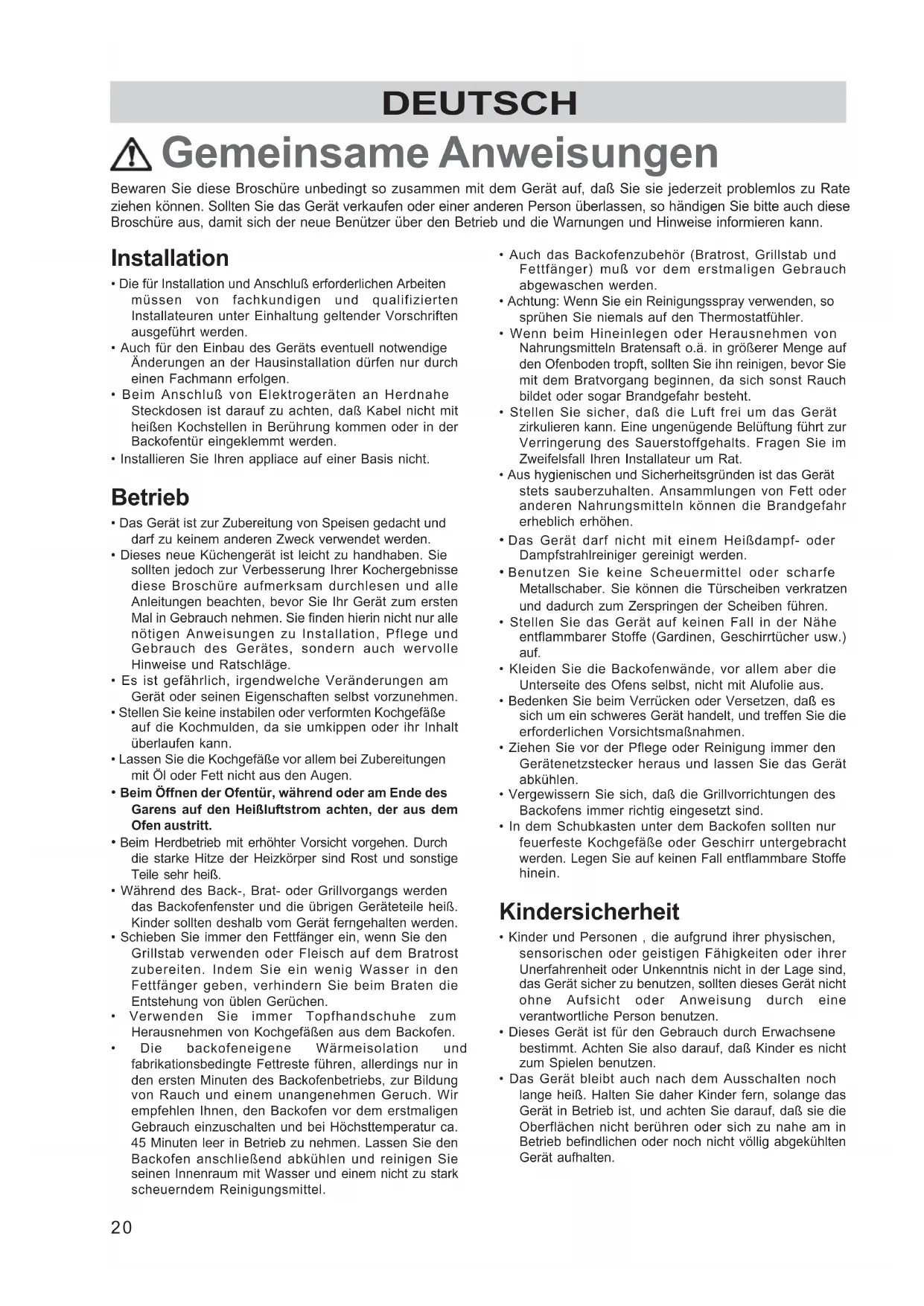 Broschüre aus, damit sich der neue Benützer über den Betrieb und die Warnungen und Hinweise informieren kann. • Auch das Backofenzubehör (Bratrost, Grillstab undFettfänger) muß vor dem erstmaligen Gebrauchabgewaschen werden.• Achtung: Wenn Sie ein Reinigungsspray verwenden, sosprühen Sie niemals auf den Thermostatfühler.• Wenn beim Hineinlegen oder Herausnehmen vonNahrungsmitteln Bratensaft o.ä. in größerer Menge aufden Ofenboden tropft, sollten Sie ihn reinigen, bevor Siemit dem Bratvorgang beginnen, da sich sonst Rauchbildet oder sogar Brandgefahr besteht.• Stellen Sie sicher, daß die Luft frei um das Gerätzirkulieren kann. Eine ungenügende Belüftung führt zurVerringerung des Sauerstoffgehalts. Fragen Sie imZweifelsfall Ihren Installateur um Rat.• Aus hygienischen und Sicherheitsgründen ist das Gerätstets sauberzuhalten. Ansammlungen von Fett oderanderen Nahrungsmitteln können die Brandgefahrerheblich erhöhen. • Das Gerät darf nicht mit einem Heißdampf- oder Dampfstrahlreiniger gereinigt werden. • Benutzen Sie keine Scheuermittel oder scharfe Metallschaber. Sie können die Türscheiben verkratzenund dadurch zum Zerspringen der Scheiben führen.• Stellen Sie das Gerät auf keinen Fall in der Näheentflammbarer Stoffe (Gardinen, Geschirrtücher usw.) auf. • Kleiden Sie die Backofenwände, vor allem aber dieUnterseite des Ofens selbst, nicht mit Alufolie aus.• Bedenken Sie beim Verrücken oder Versetzen, daß essich um ein schweres Gerät handelt, und treffen Sie dieerforderlichen Vorsichtsmaßnahmen.• Ziehen Sie vor der Pflege oder Reinigung immer denGerätenetzstecker heraus und lassen Sie das Gerätabkühlen.• Vergewissern Sie sich, daß die Grillvorrichtungen desBackofens immer richtig eingesetzt sind.• In dem Schubkasten unter dem Backofen sollten nurfeuerfeste Kochgefäße oder Geschirr untergebrachtwerden. Legen Sie auf keinen Fall entflammbare Stoffehinein. Kindersicherheit • Kinder und Personen , die aufgrund ihrer physischen,sensorischen oder geistigen Fähigkeiten oder ihrerUnerfahrenheit oder Unkenntnis nicht in der Lage sind,das Gerät sicher zu benutzen, sollten dieses Gerät nichtohne Aufsicht oder Anweisung durch eineverantwortliche Person benutzen.• Dieses Gerät ist für den Gebrauch durch Erwachsenebestimmt. Achten Sie also darauf, daß Kinder es nichtzum Spielen benutzen.• Das Gerät bleibt auch nach dem Ausschalten nochlange heiß. Halten Sie daher Kinder fern, solange dasGerät in Betrieb ist, und achten Sie darauf, daß sie dieOberflächen nicht berühren oder sich zu nahe am inBetrieb befindlichen oder noch nicht völlig abgekühltenGerät aufhalten. Installation • Die für Installation und Anschluß erforderlichen Arbeitenmüssen von fachkundigen und qualifiziertenInstallateuren unter Einhaltung geltender Vorschriftenausgeführt werden.• Auch für den Einbau des Geräts eventuell notwendigeÄnderungen an der Hausinstallation dürfen nur durcheinen Fachmann erfolgen.• Beim Anschluß von Elektrogeräten an HerdnaheSteckdosen ist darauf zu achten, daß Kabel nicht mitheißen Kochstellen in Berührung kommen oder in derBackofentür eingeklemmt werden.• Installieren Sie Ihren appliace auf einer Basis nicht. Betrieb • Das Gerät ist zur Zubereitung von Speisen gedacht unddarf zu keinem anderen Zweck verwendet werden.• Dieses neue Küchengerät ist leicht zu handhaben. Siesollten jedoch zur Verbesserung Ihrer Kochergebnissediese Broschüre aufmerksam durchlesen und alleAnleitungen beachten, bevor Sie Ihr Gerät zum erstenMal in Gebrauch nehmen. Sie finden hierin nicht nur allenötigen Anweisungen zu Installation, Pflege undGebrauch des Gerätes, sondern auch wervolleHinweise und Ratschläge.• Es ist gefährlich, irgendwelche Veränderungen amGerät oder seinen Eigenschaften selbst vorzunehmen.• Stellen Sie keine instabilen oder verformten Kochgefäßeauf die Kochmulden, da sie umkippen oder ihr Inhaltüberlaufen kann.• Lassen Sie die Kochgefäße vor allem bei Zubereitungenmit Öl oder Fett nicht aus den Augen. • Beim Öffnen der Ofentür, während oder am Ende des Garens auf den Heißluftstrom achten, der aus demOfen austritt. • Beim Herdbetrieb mit erhöhter Vorsicht vorgehen. Durch die starke Hitze der Heizkörper sind Rost und sonstigeTeile sehr heiß.• Während des Back-, Brat- oder Grillvorgangs werdendas Backofenfenster und die übrigen Geräteteile heiß.Kinder sollten deshalb vom Gerät ferngehalten werden.• Schieben Sie immer den Fettfänger ein, wenn Sie denGrillstab verwenden oder Fleisch auf dem Bratrostzubereiten. Indem Sie ein wenig Wasser in denFettfänger geben, verhindern Sie beim Braten dieEntstehung von üblen Gerüchen.• Verwenden Sie immer Topfhandschuhe zumHerausnehmen von Kochgefäßen aus dem Backofen.• Die backofeneigene Wärmeisolation undfabrikationsbedingte Fettreste führen, allerdings nur inden ersten Minuten des Backofenbetriebs, zur Bildungvon Rauch und einem unangenehmen Geruch. Wirempfehlen Ihnen, den Backofen vor dem erstmaligenGebrauch einzuschalten und bei Höchsttemperatur ca.45 Minuten leer in Betrieb zu nehmen. Lassen Sie denBackofen anschließend abkühlen und reinigen Sieseinen Innenraum mit Wasser und einem nicht zu starkscheuerndem Reinigungsmittel. DEUTSCH21